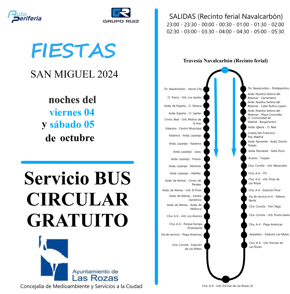 Con motivo de las Fiestas de San Miguel 2024, y con el objetivo de mejorar la movilidad y seguridad de los vecinos, el Ayuntamiento de Las Rozas ha anunciado la implementación de un servicio especial de autobuses nocturnos gratuitos. Este servicio estará disponible durante las dos noches de mayor afluencia de personas, brindando a los residentes una opción segura y conveniente para desplazarse.