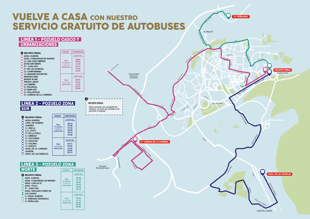 Del mismo modo se pondrá en marcha un Servicio Gratuito de Autobuses para facilitar la vuelta a casa y para lo que se han creado tres líneas. La línea 1, que recorrerá Pozuelo Casco y urbanizaciones, la Línea 2, para la zona Sur, y la Línea 3, para la zona Norte.