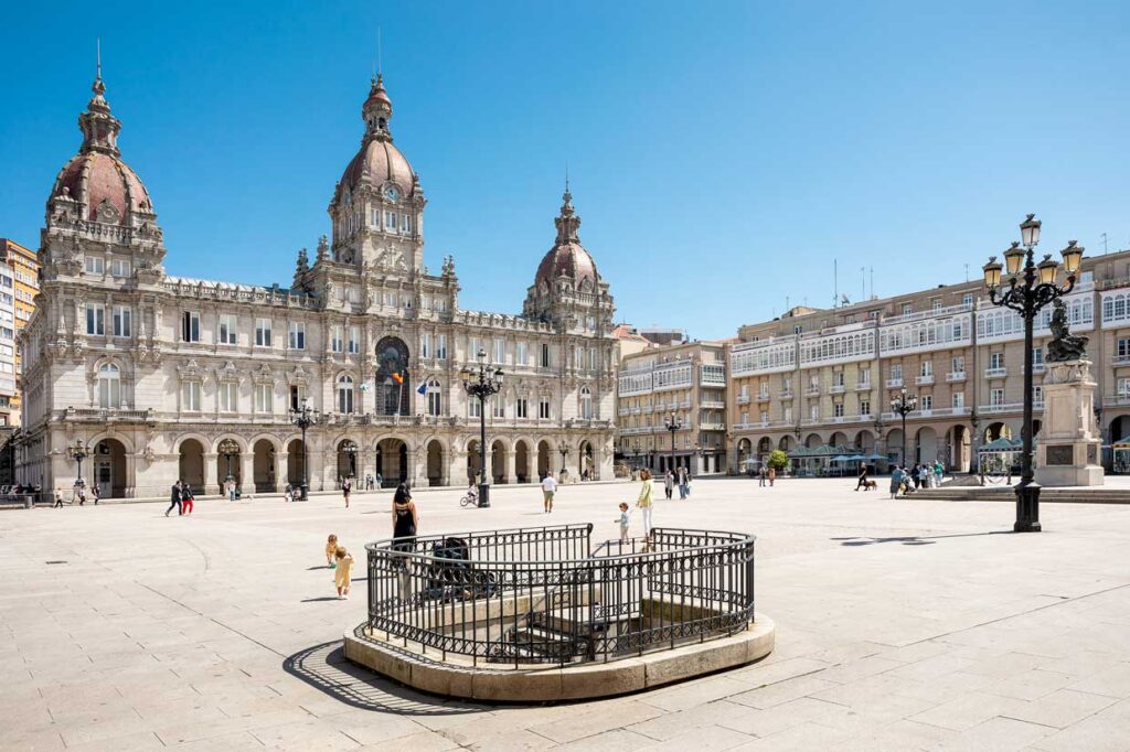 La Plaza de María Pita es un lugar perfecto para empezar. Conocida como el centro neurálgico de la ciudad, y rodeada de edificios de arquitectura académica del XIX, alberga el Ayuntamiento de A Coruña, un imponente edificio que merece una parada para admirar su fachada. En el centro de la plaza, la estatua de María Pita, heroína gallega que defendió la ciudad durante el ataque inglés de 1589, otro de los símbolos más representativos de la ciudad.