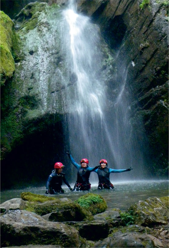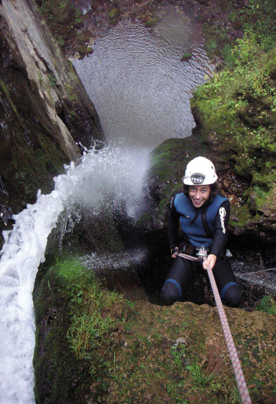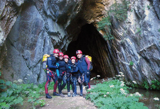 Vamos de sorpresa en sorpresa. Rápeles, saltos, toboganes, el sonido del agua y las risas y gritos de emoción de los compañeros, reverberan el las grandes salas hasta llegar a la Covona. Esta, es una gran gruta escondida en medio de un bosque de hayas, por la que el río subterráneo sale al exterior.