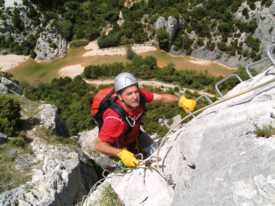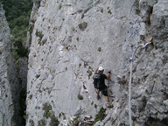 Una Vía Ferrata es un itinerario deportivo situado en una pared rocosa y equipada con elementos específicos (cables, escalones, pasamanos,…) destinados a facilitarnos la progresión y optimizar la seguridad de los usuarios. Se trata de una actividad a caballo entre el senderismo y la escalada, aunque con sus propias características, técnicas, materiales y equipación.
