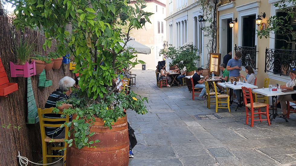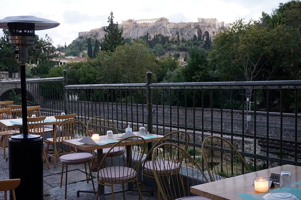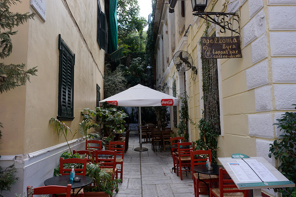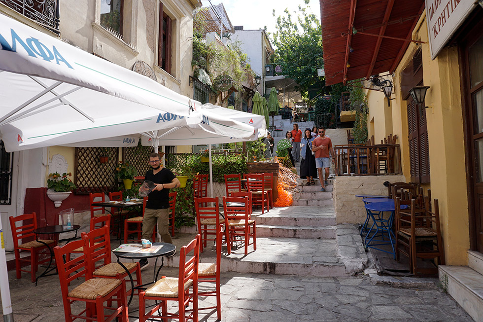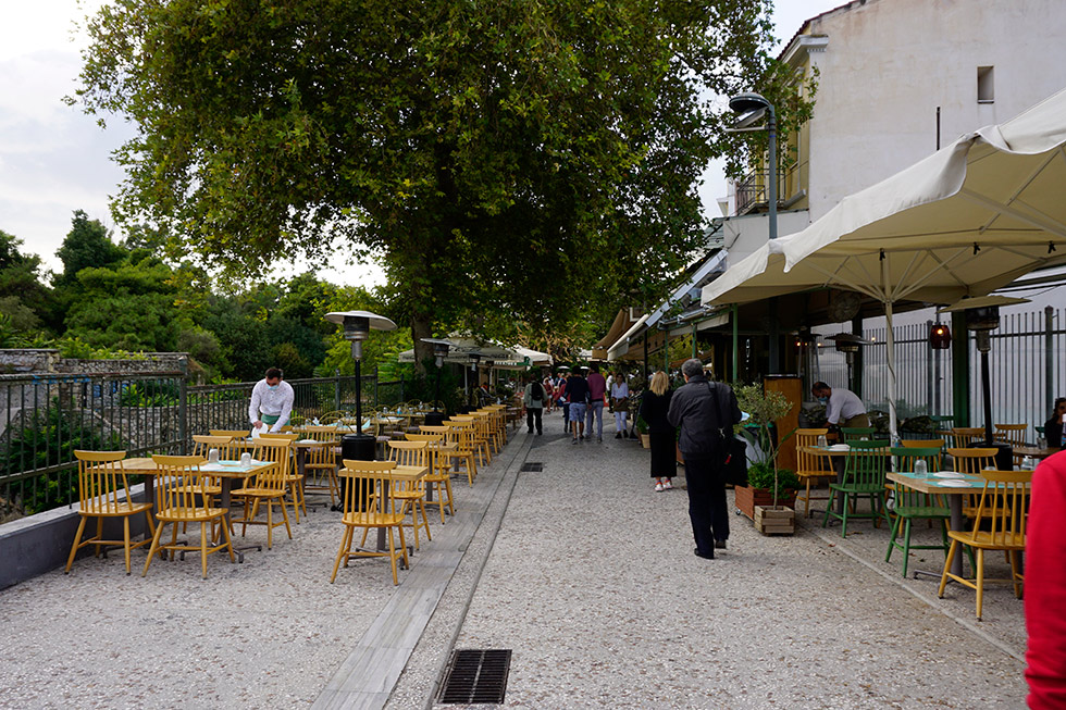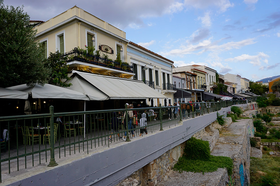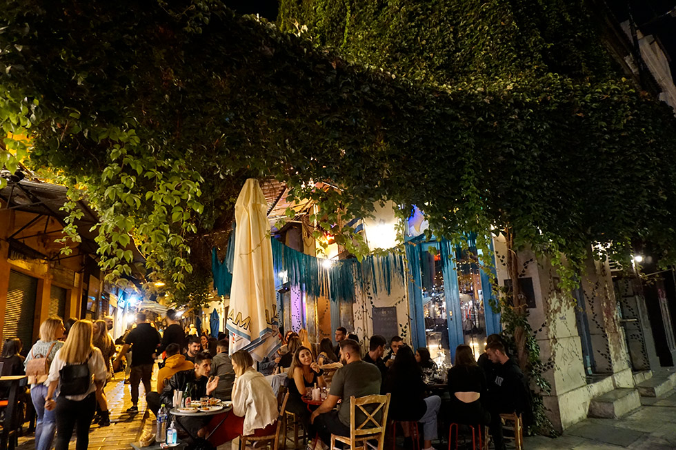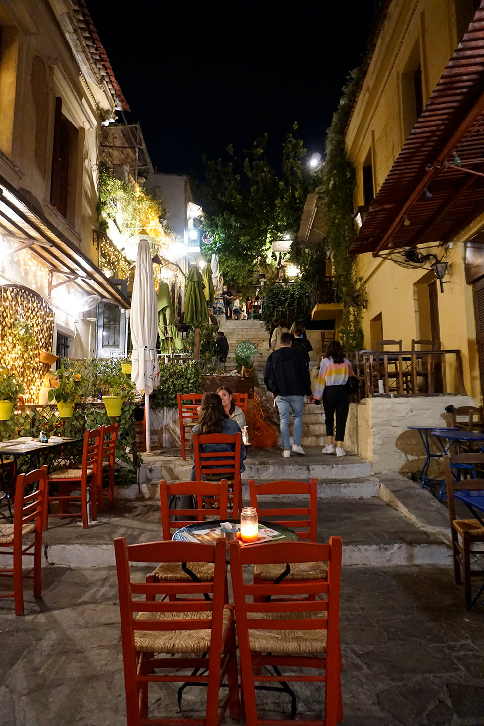 Adrianou está repleto de acogedoras terrazas de restaurantes y tabernas que invitan a sentarse a la luz de las velas. La calle peatonal linda con los restos arqueológicos del Ágora, algunos de los cuales desprenden una luz muy cálida. Una zona fantástica para degustar los deliciosos platos de la cocina griega bajo la atenta mirada de la Acrópolis.