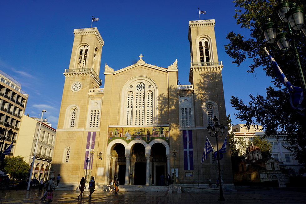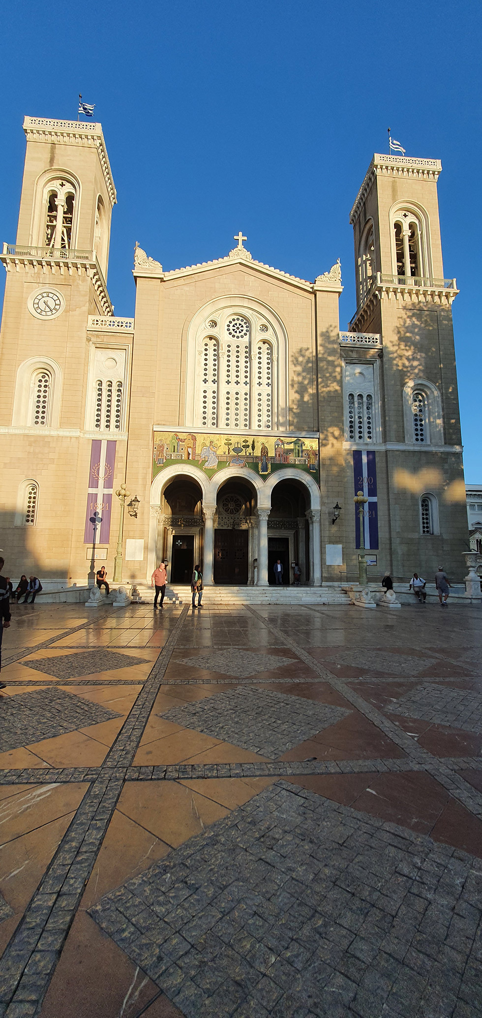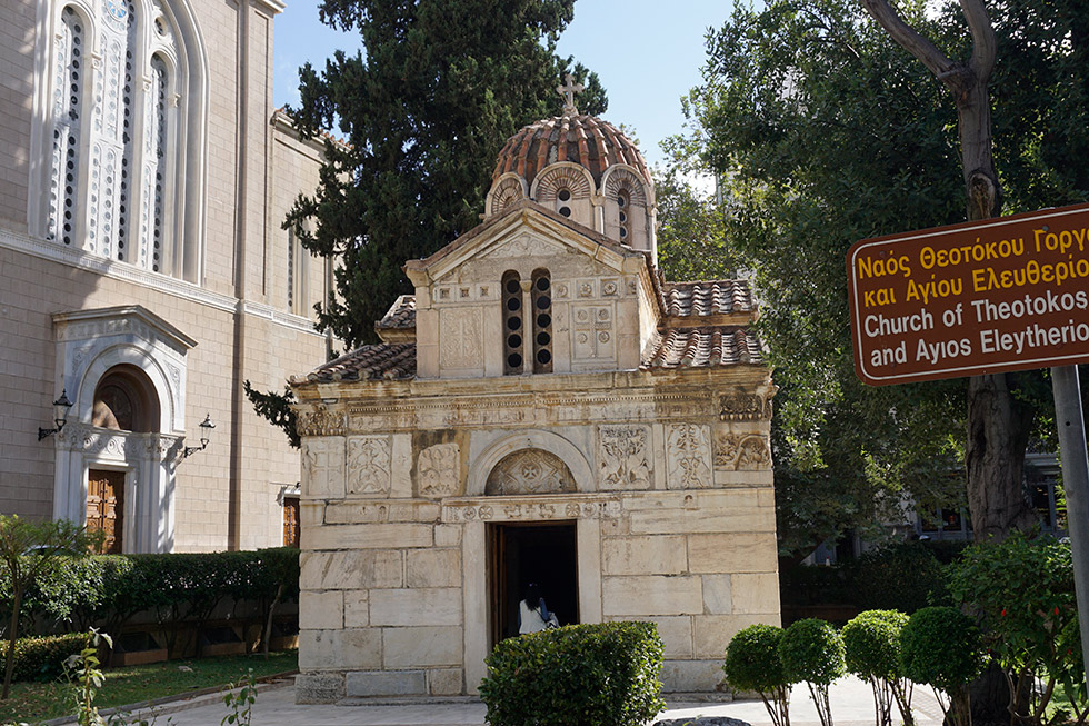 Salimos a pasear por los alrededores del hotel, en pleno barrio de Plaka, el más antiguo de Atenas en el que nos perdimos por sus laberínticas y animadas calles de numerosos comercios y restaurantes. Nos topamos con la magnífica Catedral Metropolitana, la iglesia ortodoxa más grande e importante y sede del obispo. Cercana, una pequeña ermita de mármol abovedada con mezcla estilos románico y bizantino embellece la plaza Mitropolis. Se trata de la antigua catedral, contigua a la nueva. Terrazas de restaurantes y cafeterías rodean tan enigmático templo.