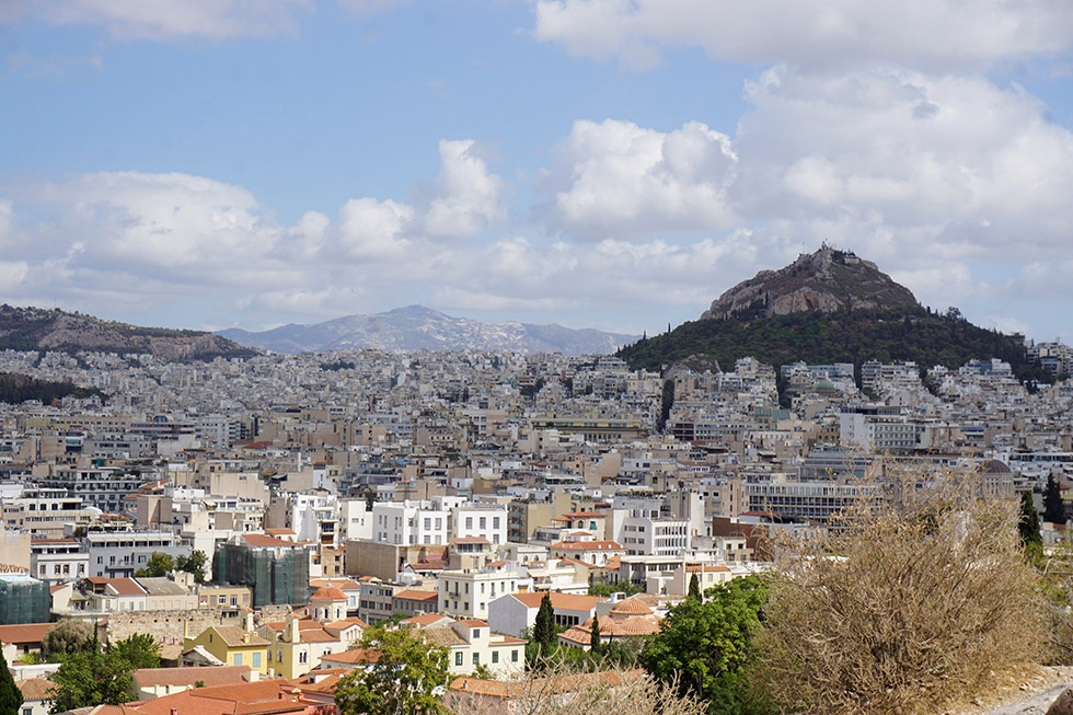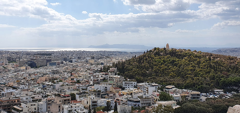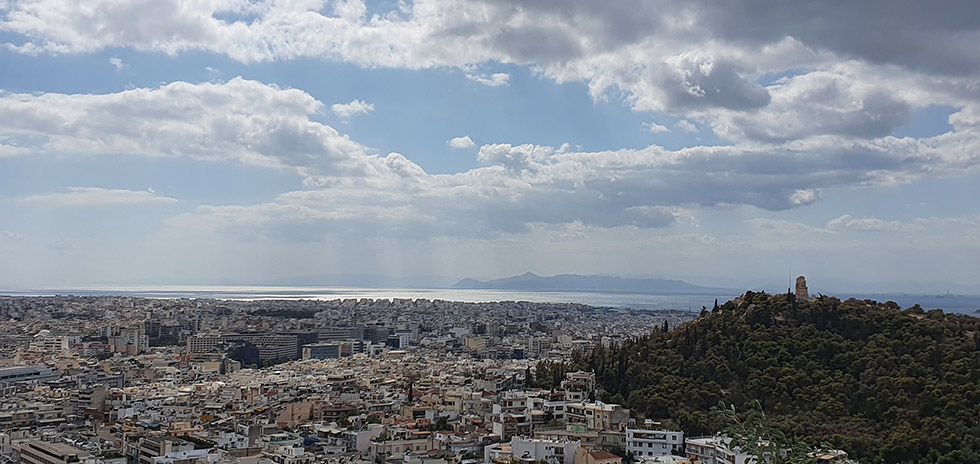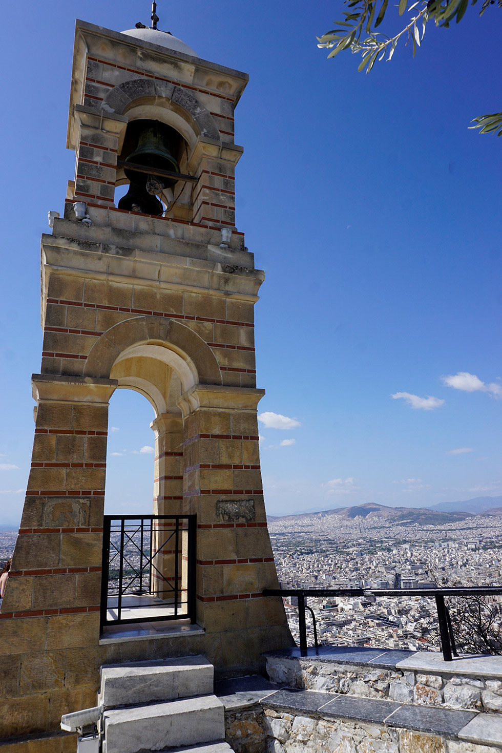 Una vez en la cumbre, nos recibe una atractiva ermita ortodoxa encalada en blanco a azul. Es la Iglesia de San Jorge, que se halla cerrada. La explanada está rodeada de grandes balcones que se abren a asombrosas panorámicas con Atenas a nuestros pies. A lo lejos, el Partenón y el litoral. Este emplazamiento ofrece las mejores vistas de la ciudad. La noche también puede ser un buen momento para acercarse. Nos comentan que los locales llegan a la cima caminando por el puerto en menos de una hora, sea como sea hay que subir a contemplar tan extraordinario paisaje.