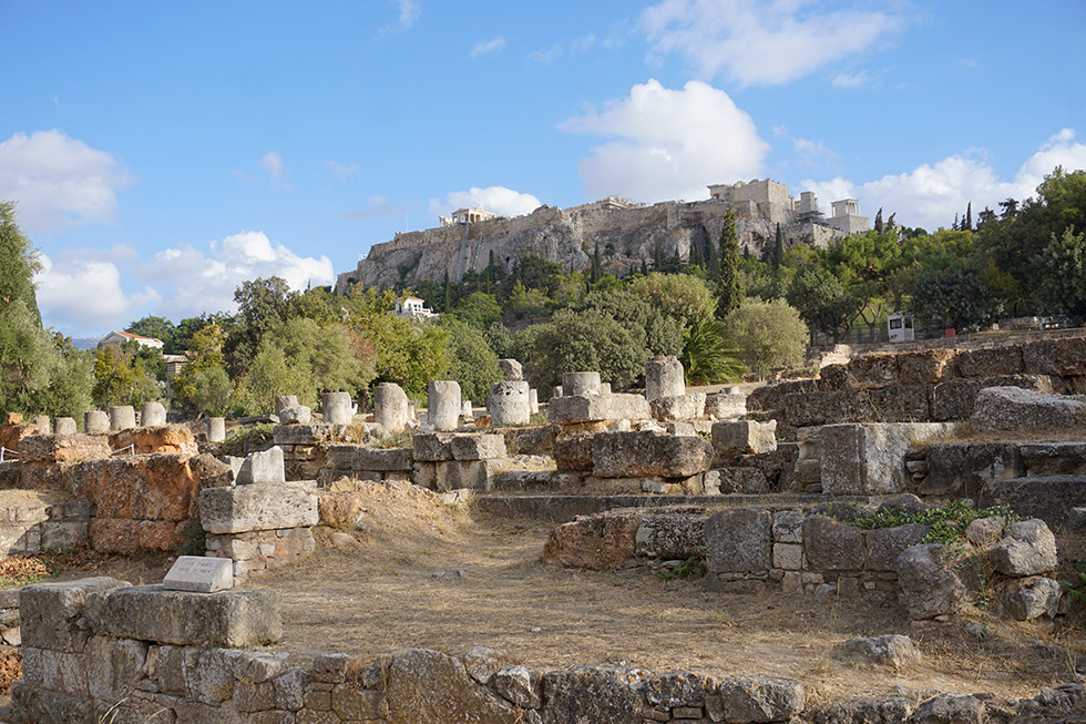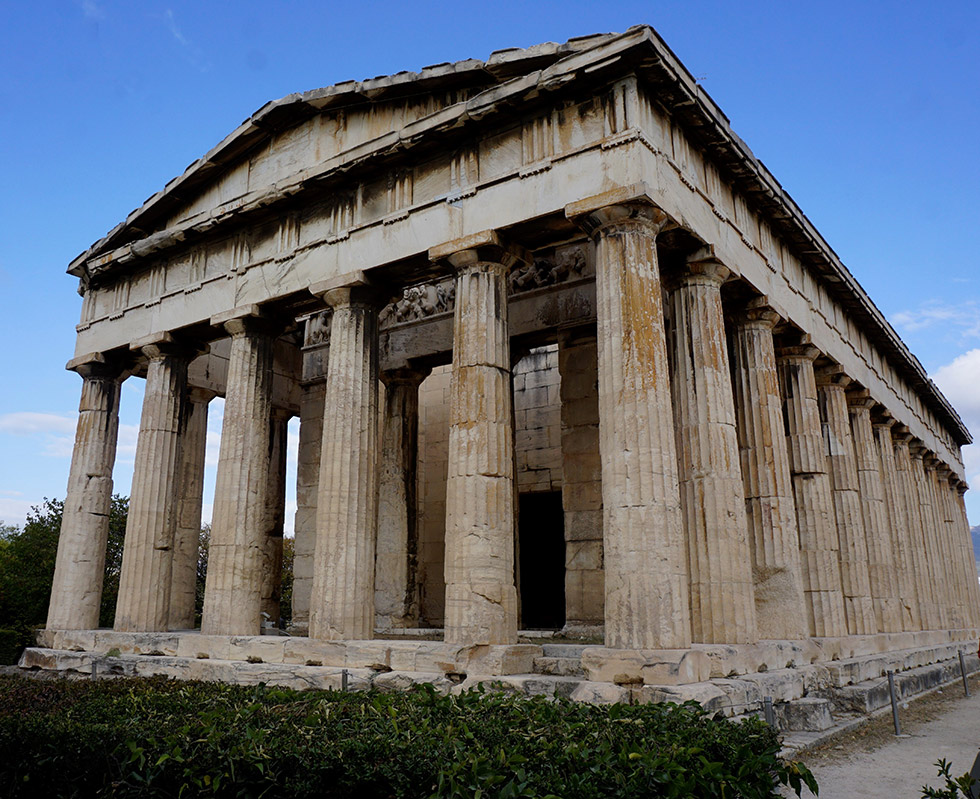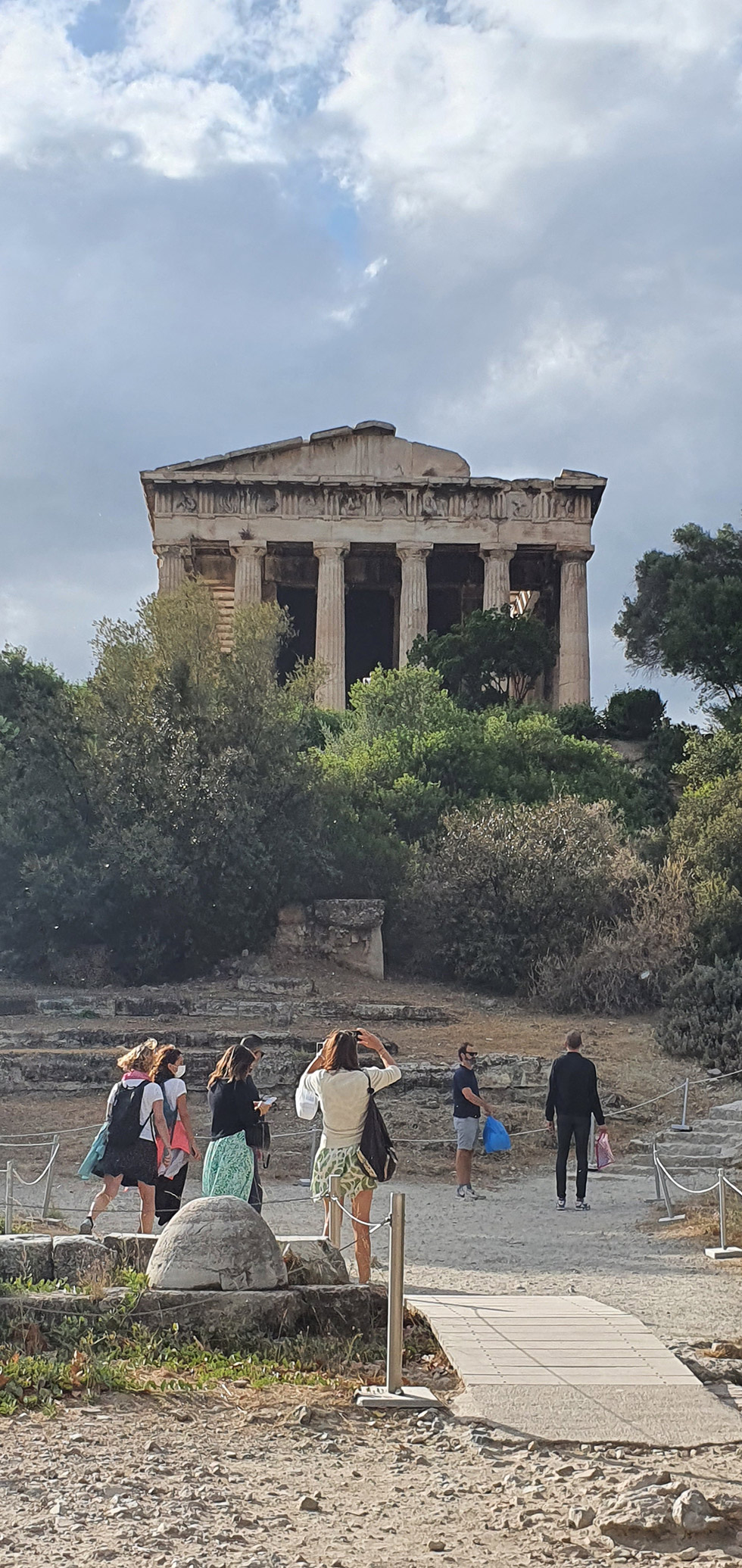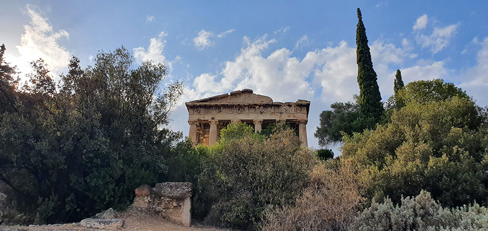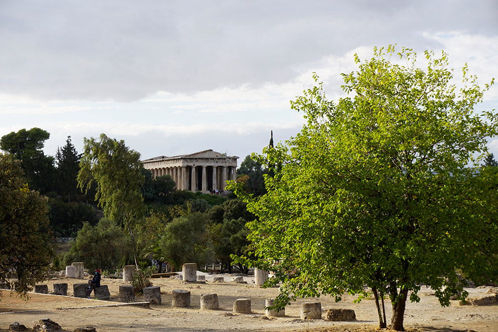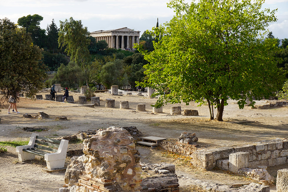Estuvimos unas dos horas en la Acrópolis y una vez fuera nos dirigimos al Ágora. Situada al norte de la Acrópolis, el gran Ágora (plaza) está rodeada de vegetación e invita a dar un agradable paseo mientras nos muestra sus tesoros y nos transporta a la antigua Grecia. En esta monumental área se halla uno de los templos dóricos mejor conservados, el templo de Hefesto o Hefestión, que nos recuerda al Partenón y que, al visitarlo al atardecer, resulta prodigioso.