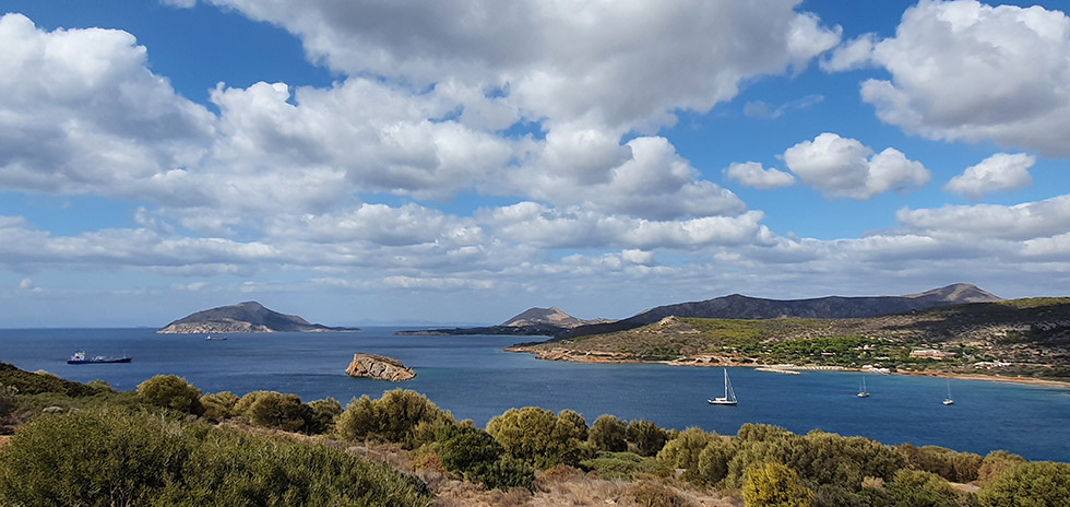 Circulamos por la carretera que es prolongación de la Avenida Vouliagmeni. En el recorrido por el paseo marítimo dejamos atrás playas de arena, hoteles, chiringuitos, escuelas de windsurf, buceo, esquí acuático… y nos adentramos en una sinuosa carretera costera. Cada curva enseña puertos pesqueros y pequeñas calas de azul turquesa donde las rocas forman piscinas naturales de agua cristalina. En la lejanía se vislumbran islotes e islas. Algunos resorts se encuentran en lugares panorámicos de arenales y palmeras. Hacía un maravilloso y apacible día de sol y el paisaje es seductor. En el lado opuesto, las colinas se hallan salpicadas de lindas casitas con frondosa vegetación. Tardamos en llegar aproximadamente una hora y media desde el hotel, por una carretera que se halla continuamente ligada al mar.