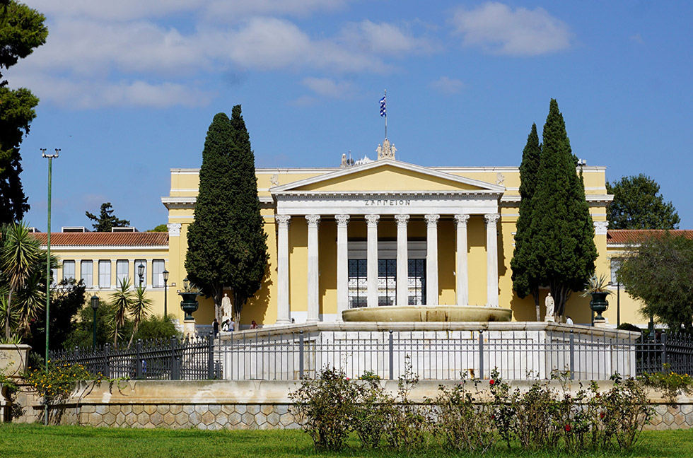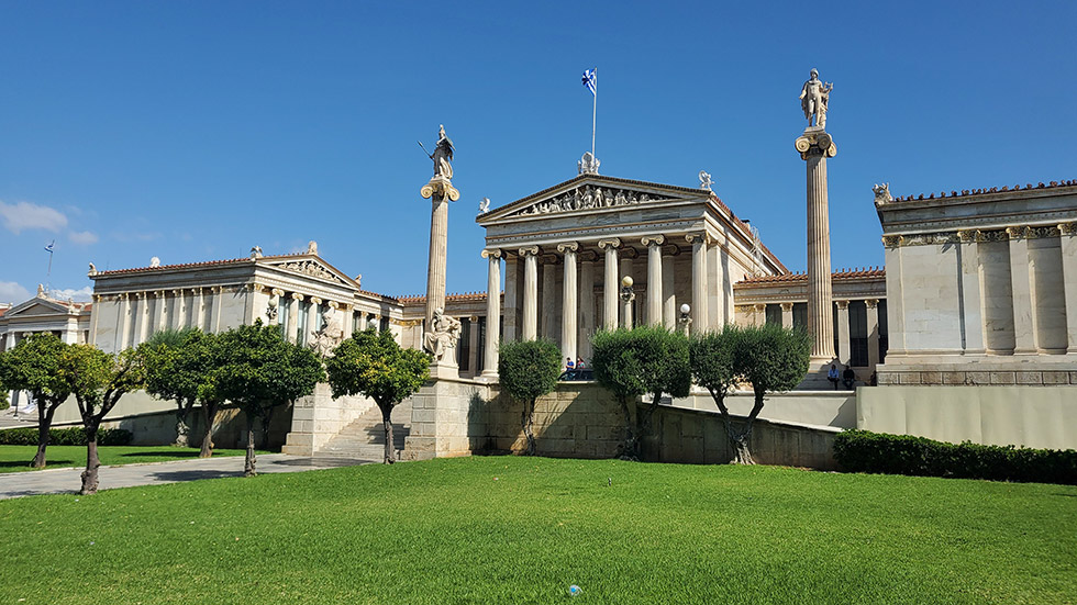 Dejando atrás la Plaza de Omonia, tomamos la avenida de Panepistimiou que une ésta con la Plaza de Syntagma, dos de las plazas más relevantes de Atenas. Esta larga travesía acoge varias edificaciones históricas: la Biblioteca Nacional, la Academia de Bellas Artes y la Universidad, alineándose en un bello tramo. Se trata de tres edificios neoclásicos, los más importantes de la capital griega. El diseño y la estructura de la trilogía forma un conjunto único. Realizamos una parada para admirar tan regios edificios.