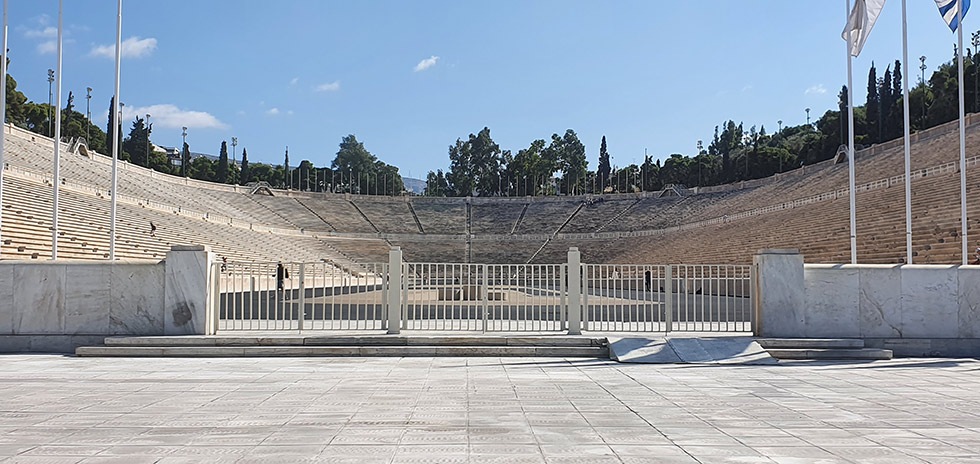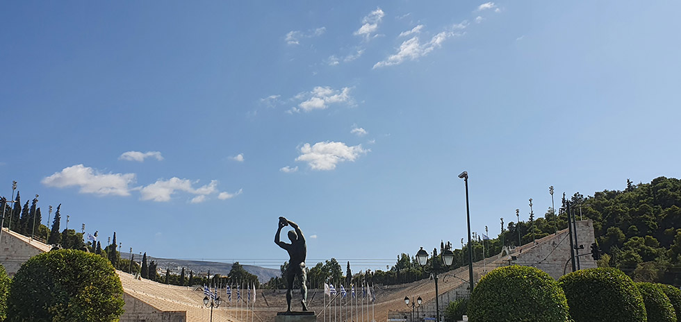 Alcanzamos el mítico Estadio Olímpico Panathinaiko, donde se celebraron los primeros Juegos Olímpicos en 1896 y que fue construido en el mismo lugar donde se celebraban las competiciones deportivas en honor a la Diosa Atenea. Es uno de los estadios más antiguos del mundo y el primer gran estadio del mundo moderno. Un impresionante graderío abierto, construido en mármol blanco, donde observamos desde la entrada, a algunos visitantes correr atléticamente por la emblemática pista evocando tiempos pasados.