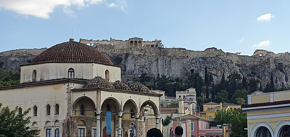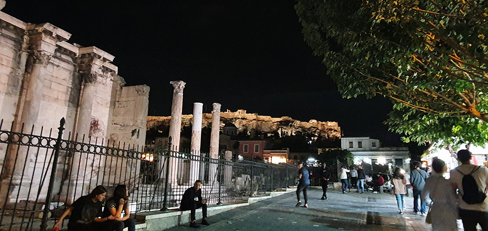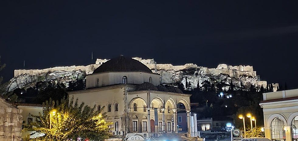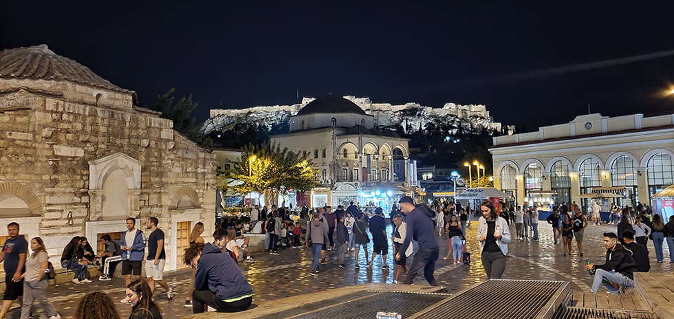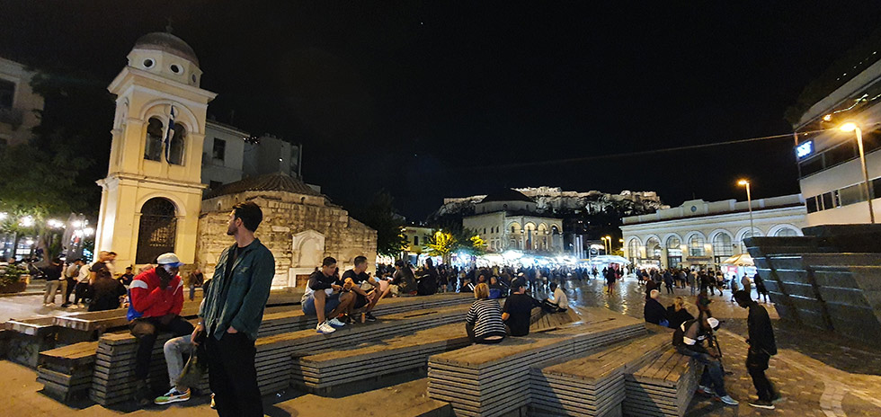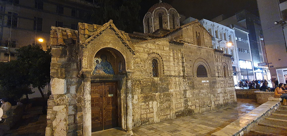 Caminamos por la calle Kapnikareas, en la que encontramos encajonada entre edificios y escaparates, otra antigua y pequeña iglesia ortodoxa de origen bizantino. En la oscuridad, resulta conmovedora. Dejándonos llevar por la calle Adrianou, llegamos a la bulliciosa Plaza de Monastiraki. Esta gran plaza nos presenta varios planos: una bonita iglesia bizantina, ruinas griegas y romanas y una antigua mezquita que encontramos iluminada. La composición resulta extraordinaria. Varios tenderetes de fruta, castañas, maíz y porciones de coco se acoplan por los alrededores. También músicos y vendedores ambulantes.  El ambiente es un tanto desorganizado del que disfrutan familias, grupos de jóvenes, mayores y turistas. Esta plaza es un punto de encuentro de los atenienses.