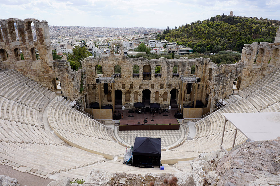 El Odeón de Herodes Ático, es muy parecido a un teatro romano. Construido en el s.II d.C. por tan acaudalado ciudadano, estaba cubierto en su día y actualmente se utiliza para espectáculos, teatro, óperas y conciertos. Coincidimos en la fecha con un concierto del cantante Sting, al que nos fue imposible asistir por no tener entradas. Es un emplazamiento extraordinario para ver cualquier evento.