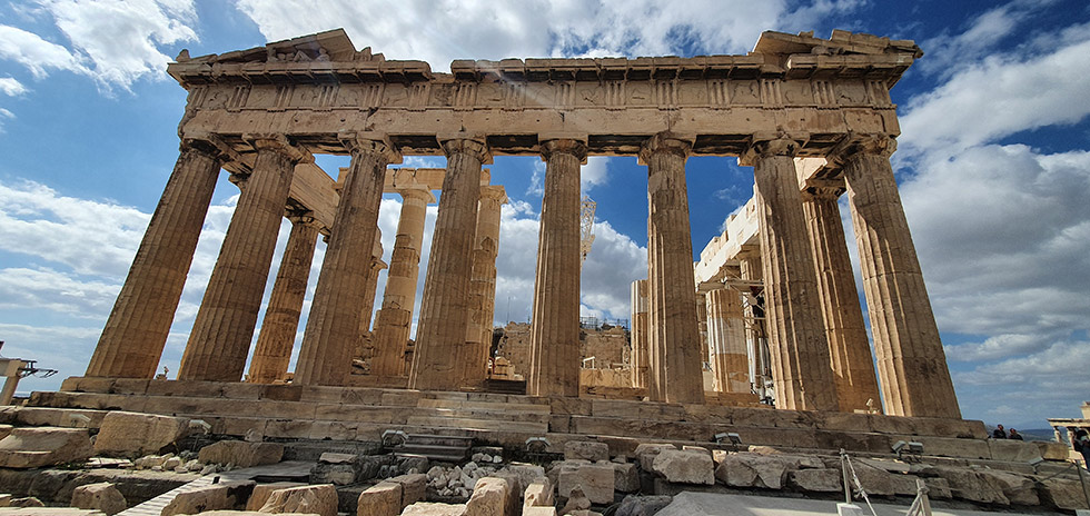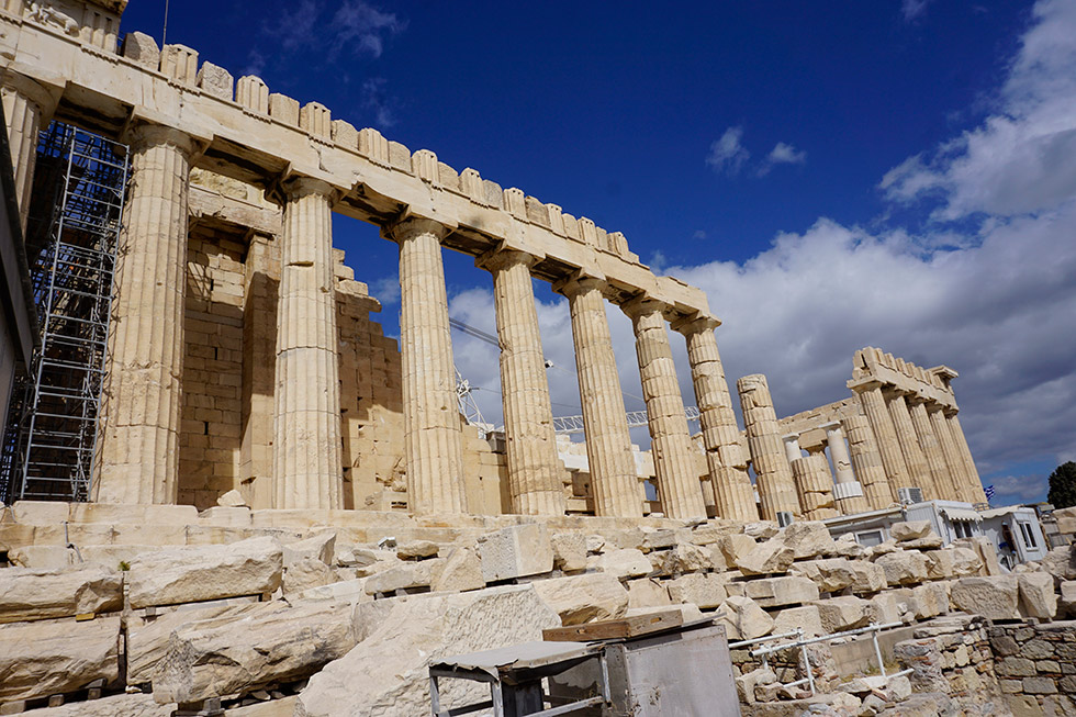 Una vez atravesamos el umbral, aparece El Partenón. Construido entre el 447 a.C. y 432 a.C. Considerado templo de Atenea Partenos, consta de diecisiete imponentes columnas de largo por ocho de ancho y no estaba permitida la entrada, únicamente estaba destinado a hospedar la colosal estatua de oro y marfil de la diosa junto con el tesoro del templo. Las ofrendas se realizaban en el altar delantero del exterior frente a la divinidad que observaba todo desde el dentro. También es de mármol pentélico que tiene como característica una blancura uniforme y un brillo dorado en su exposición a la luz del sol. Los frisos de batallas y episodios mitológicos, estatuas y todo lo descubierto se expone en el Museo de La Acrópolis.