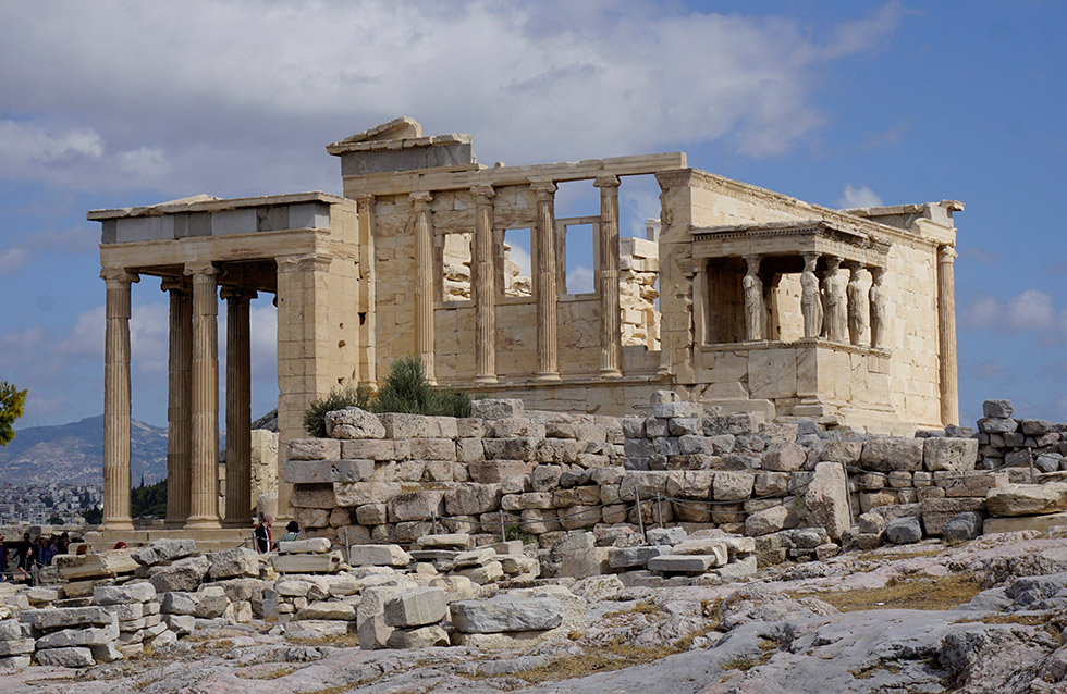 Asimismo, numerosos restos arquitectónicos se exhiben por este histórico y magnífico espacio abierto. El Templo Erecteo destaca inconfundible por la tribuna de las Cariátides. Seis estatuas de doncellas sostienen el arquitrabe. Las estatuas originales han sido sustituidas por fieles reproducciones, conservándose las primeras en el museo, excepto una, que está en el British Museum de Londres. En una de las partes del Erecteo es donde tuvo lugar la disputa entre Poseidón y Atenea por la posesión de Ática (Atenas), en la que venció la diosa.