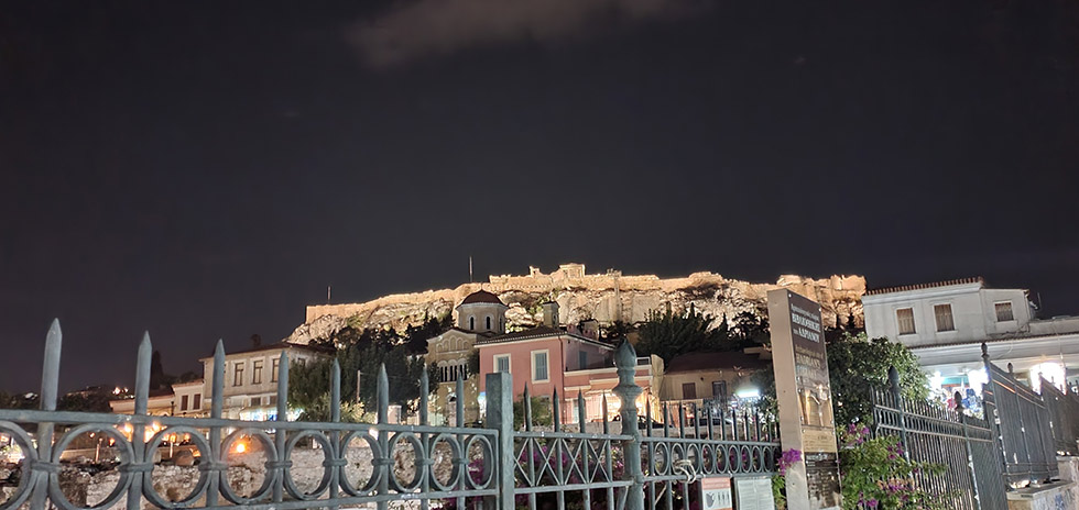 Adyacentes a la Acrópolis y el Ágora antigua, en el barrio de Psirí se encuentra el complejo arqueológico del Cerámico, la zona del antiguo cementerio. Regresando desde el Cerámico nos adentramos en la calle Adrianou, donde en la peculiar “Cantina Diego” hay un concierto al aire libre de música en vivo, variopintos sillones se instalan en plena calle peatonal, el ambiente es muy animado en esta parte. Los atenienses disfrutan en bares y restaurantes a la luz de las velas. Sobre nuestras cabezas, la encendida e inspiradora Acrópolis….