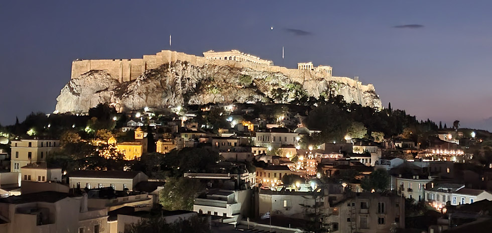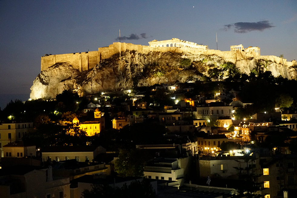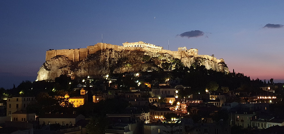 Nos alojamos en el Hotel Central situado en la calle Apollonos 21, que tiene una excelente ubicación. Se halla a 6 minutos a pie de la estación de metro, a 9 minutos a pie de la Plaza Sintagma y a 1 km de la Acrópolis. Desde la terraza-restaurante, goza de unas espectaculares perspectivas de la Acrópolis. La llegada del atardecer nos deleitó con una maravillosa puesta de sol sobre los restos arquitectónicos, que al ir iluminándose lentamente nos dejaron múltiples y fascinantes imágenes. El conjunto de ruinas sobre la ciudad nos hechizó y sin poder apartar la vista cenamos ahí mismo…dónde mejor…
