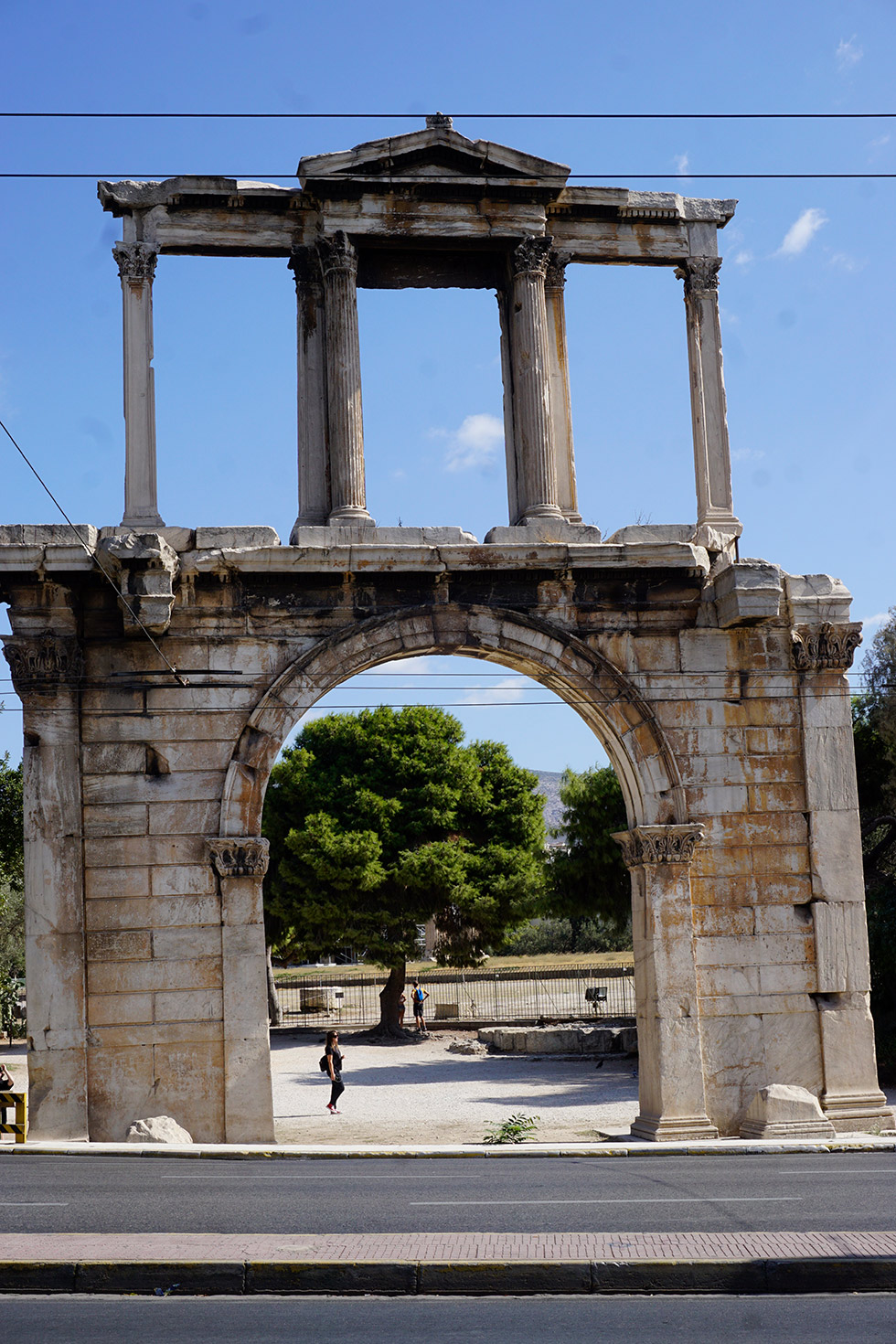 Más adelante, los vestigios del Templo de Zeus Olímpico, también conocido como Olympieion. Originariamente tenía 104 columnas de 17 metros de altura. Actualmente solo quedan 16, una de ellas se derrumbó en 1852 y es la que vemos tumbada tal y donde cayó. Contiguo, el Arco de Adriano, la puerta con un arco monumental romano, por donde acceder al Templo de Zeus Olímpico.