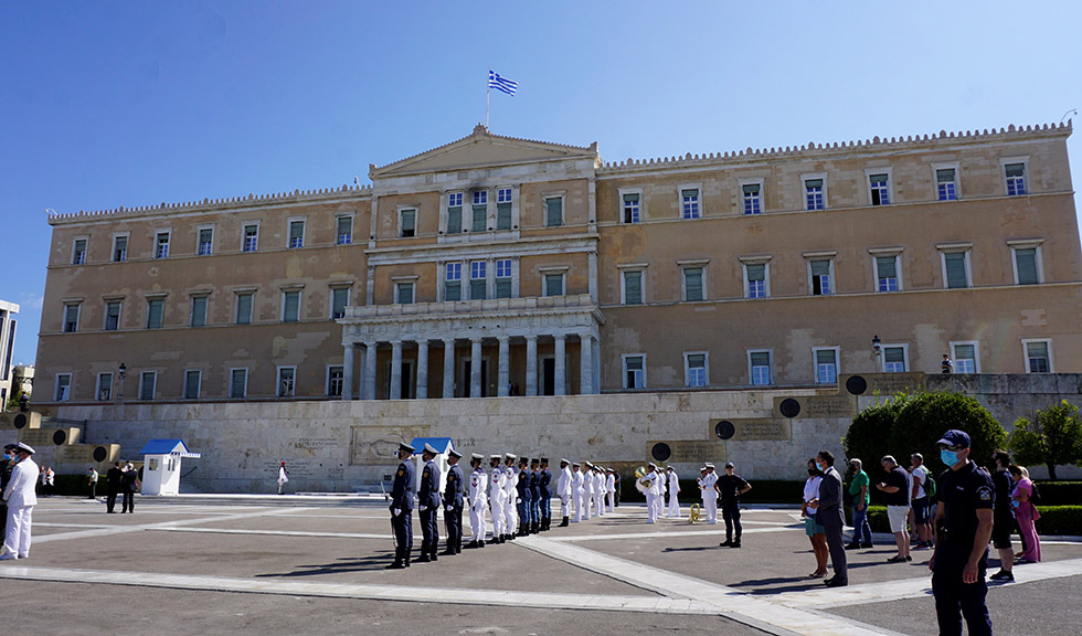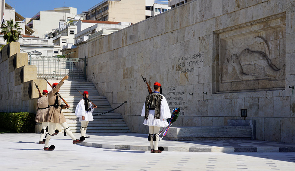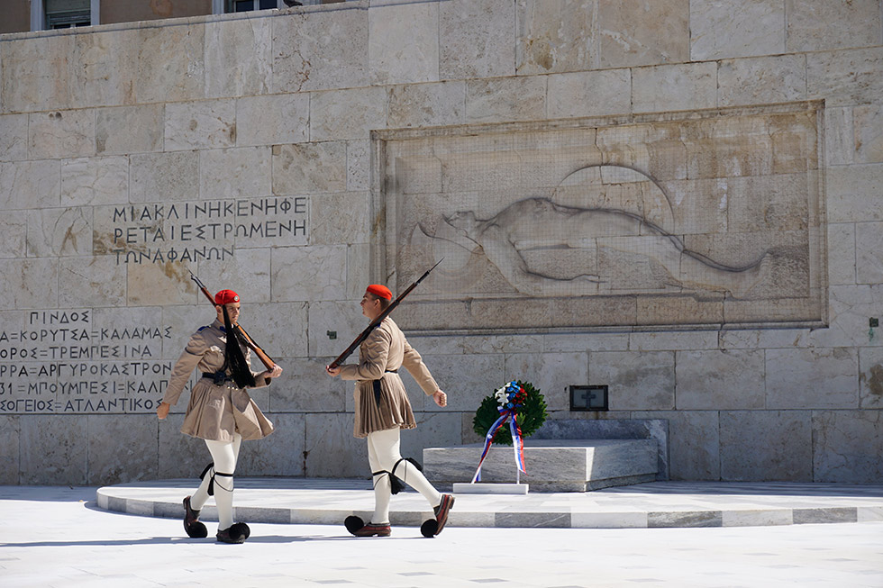 Delante de la entrada principal del Parlamento se encuentra la Tumba del Soldado Desconocido custodiada por los soldados de la Guardia Presidencial llamados “evzones”, que nos sorprenden con un original calzado de borlón en la punta. Nos deleitamos con el espectacular cambio de guardia que se celebra a las once de la mañana cada domingo, en una versión solemne, y cada hora en punto, en una versión más resumida. El paso que realizan con tanta maestría resulta bastante curioso y es digno de ver. A cámara lenta realizan una danza en que el equilibrio y la fuerza (ya que el calzado pesa unos 3,5 kilos) son fundamentales.