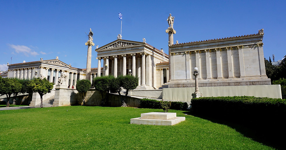 Y La Academia donde a ambos lados del edificio se alzan magníficas, las estatuas de Apolo y de Atenea sobre columnas jónicas. En la entrada, los filósofos Platón y Sócrates.