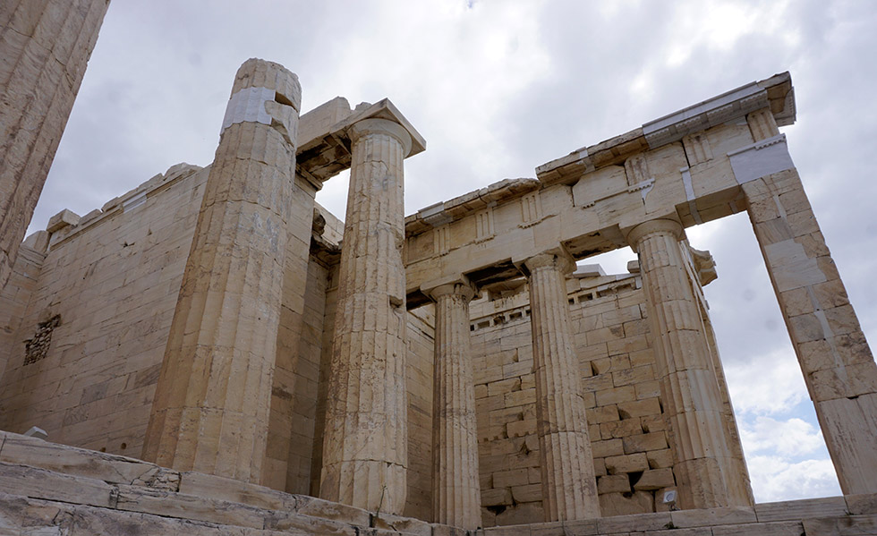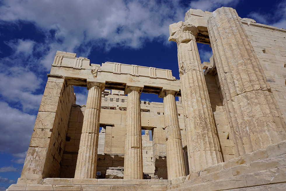 La Acrópolis fue nuevamente reconstruida tras el acuerdo de paz entre Atenas y los persas por iniciativa de Pericles a partir del 448 a.C., que también dio paso a la monumental e impresionante entrada que vemos hoy conocida por Los Propileos. De mármol pentélico (mármol procedente de las canteras del cercano monte Pentélico) las enormes columnas dóricas y dos alas de pilastras nos dejan boquiabiertos. En su interior se exponían cuadros dedicados a la diosa. Donde originariamente había una rampa, accedemos por una escalinata que se construyó en el s.I d.C. bajo el reinado del emperador Claudio.