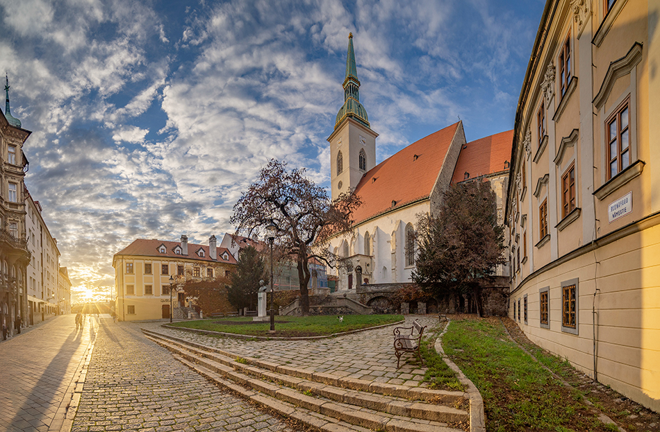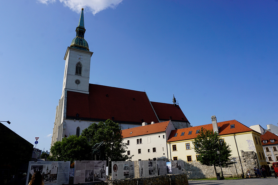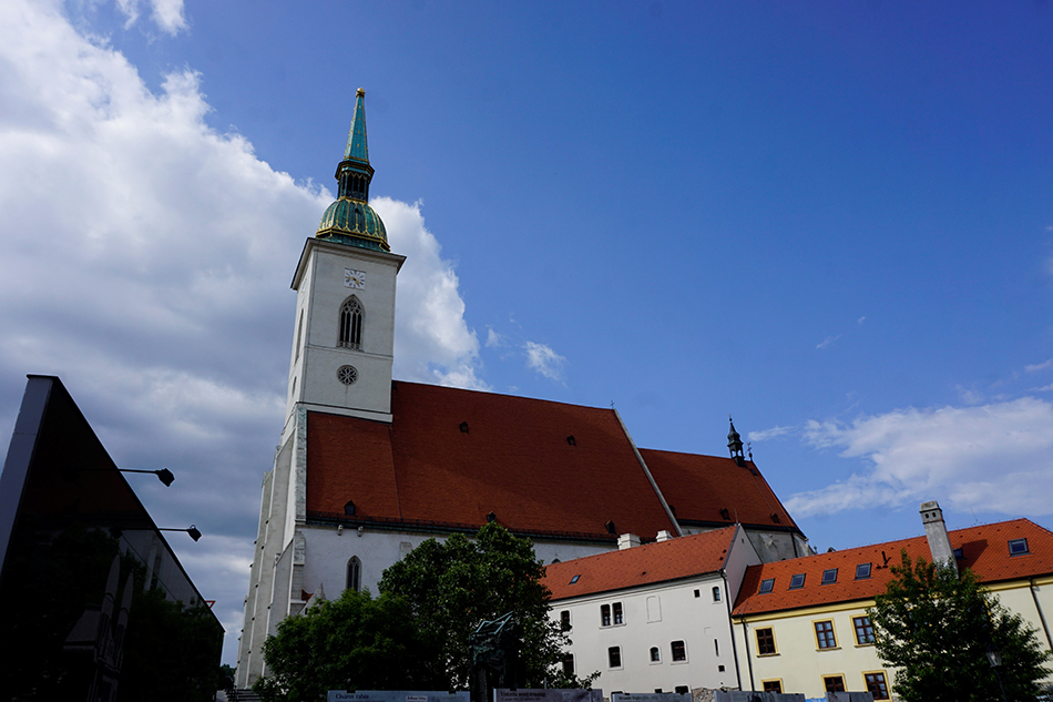 Fácilmente reconocible es también La Catedral de San Martín, ya que en la punta de su torre, en vez de una cruz, como suele ser lo habitual, hay una réplica de la Corona de San Esteban (la Santa Corona Húngara). El motivo es que en esta basílica se coronaron los monarcas del Reino de Hungría entre 1563 y 1830 siendo el primero Maximiliano II de Habsburgo en 1563. En total fueron coronados en la catedral, once reyes y ocho reinas. Las coronaciones contaban con un estricto protocolo y con interminables fiestas que hoy en día evocan las incrustaciones en forma de pequeñas coronas de latón que podemos ver en los adoquines de algunas calles peatonales indicando el “camino a la coronación”.