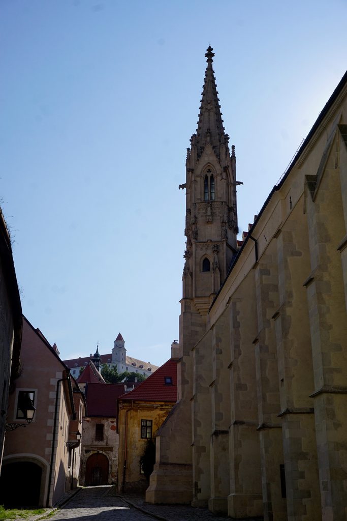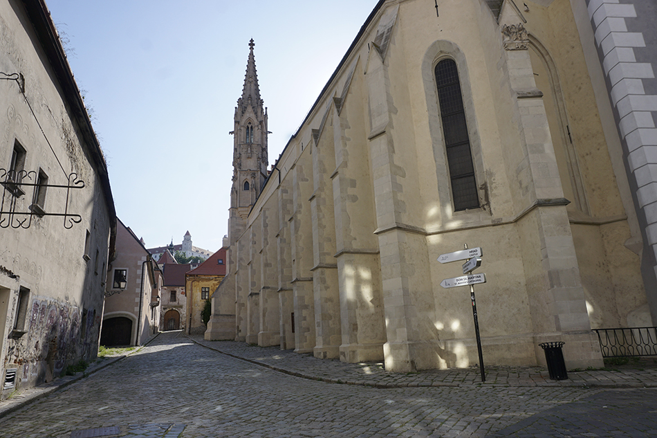 De palacios señoriales, tiendas locales y terrazas y bares, la calle peatonal Venturská nos conduce a la Puerta de San Miguel, la única puerta medieval que queda de las cuatro que tenía la ciudad para acceder dentro del recinto amurallado. Esta torre cuadrada es originaria del siglo XIV y marca el kilómetro cero de Eslovaquia, tal y como lo señala una inscripción circular con que indica la dirección y distancia a las capitales de otros países. Está rematada por el santo que le da nombre y acoge la exposición de armas y restos medievales del Museo Municipal. Se puede subir a la torre, de 51 metros desde la que se obtiene una buena panorámica del centro histórico. Hay una leyenda que dice que «si pasas hablando por debajo de la Puerta de San Miguel, morirás en un año y un día», así que ya sabéis… a cruzarla calladitos… por si acaso…