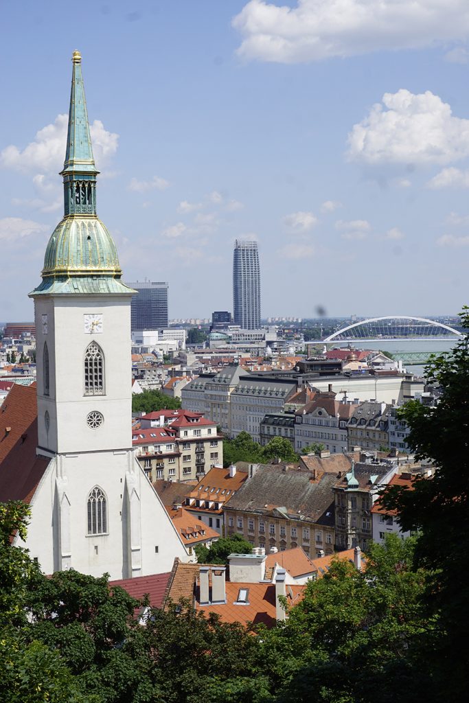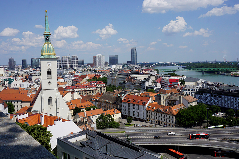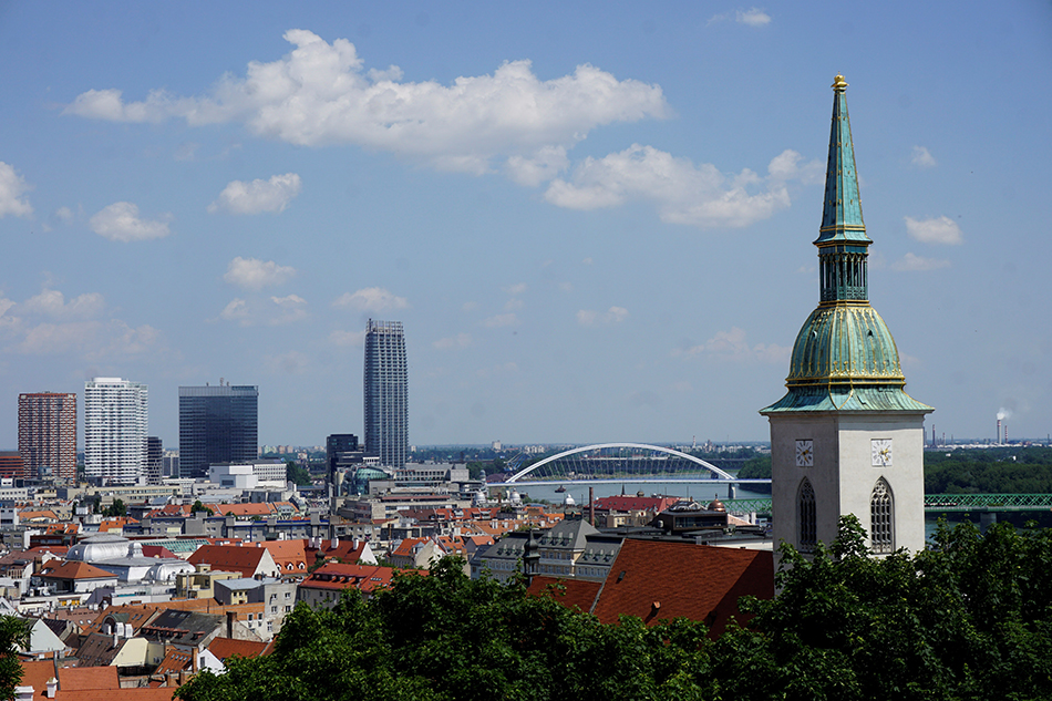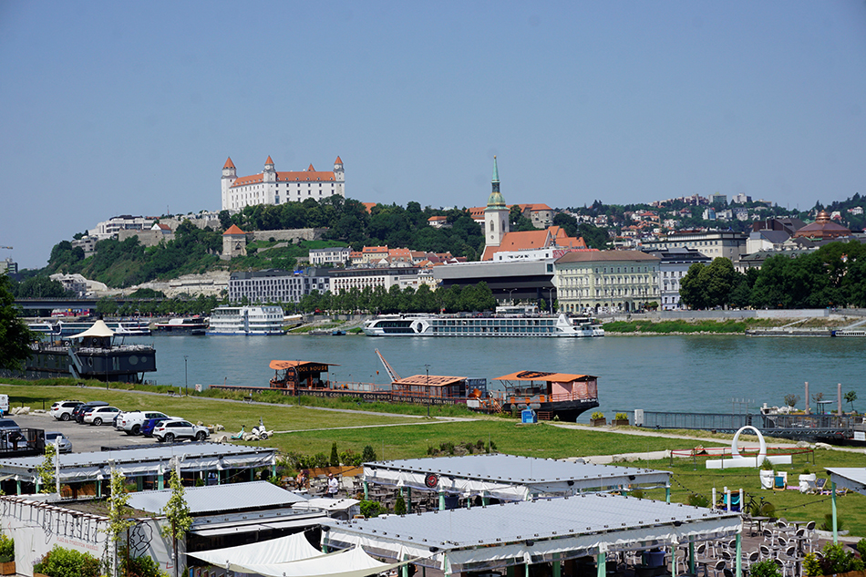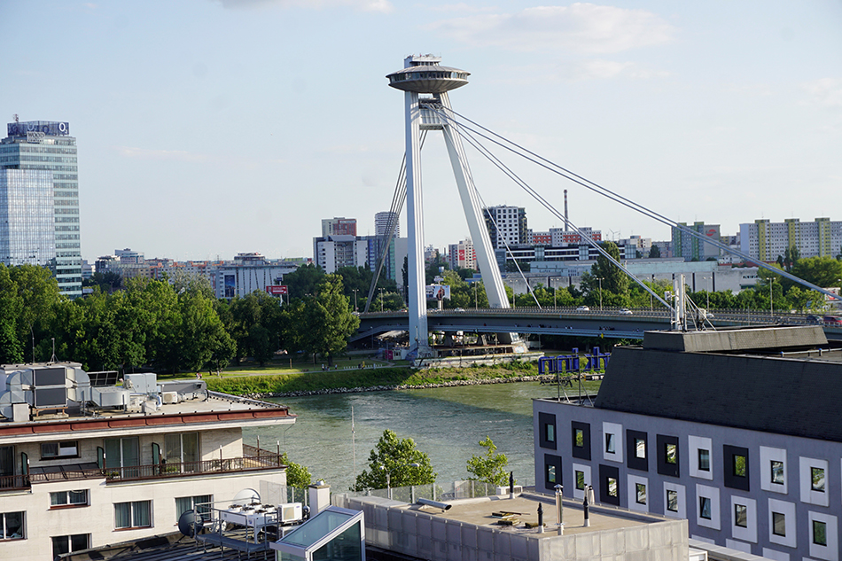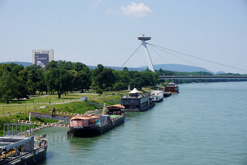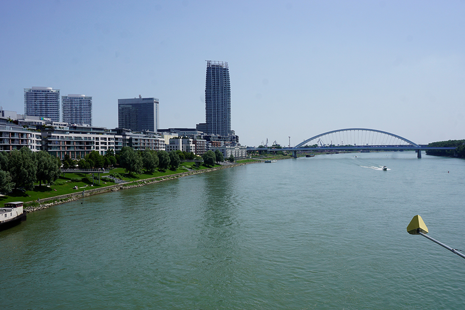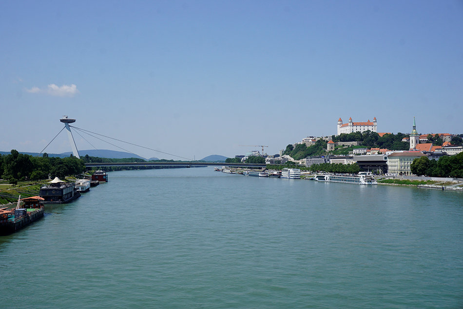 Cruzamos al otro lado del Danubio atravesando el Puente Viejo -que también dispone de carril bici- y en el que hay instalados varios miradores donde recrearse destapando unas de las mejores estampas de Bratislava, con el Danubio, el Castillo, la Catedral y el llamado UFO.