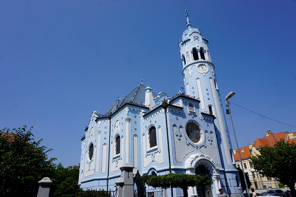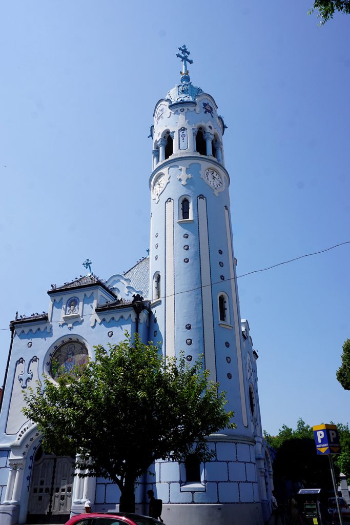 En la calle Bezručova, se halla una joya del “Art Noveau”, la Iglesia de Santa Isabel, en honor a Isabel de Hungría que creció en el castillo. Se la conoce popularmente como la “Iglesia Azul” por el color de sus muros azul pastel. Data de principios del siglo XX y diseñada por Ödön Lechner, un arquitecto conocido como el “Gaudí húngaro”. Es una preciosidad, es azul por fuera y por dentro, nos cuentan que el cura viste de azul, que tiene un coche azul y en algunas bodas los novios visten ¡de azul!. Hay listas de espera de años para poder casarse. Resulta muy vistosa y nos recuerda a una gran tarta.