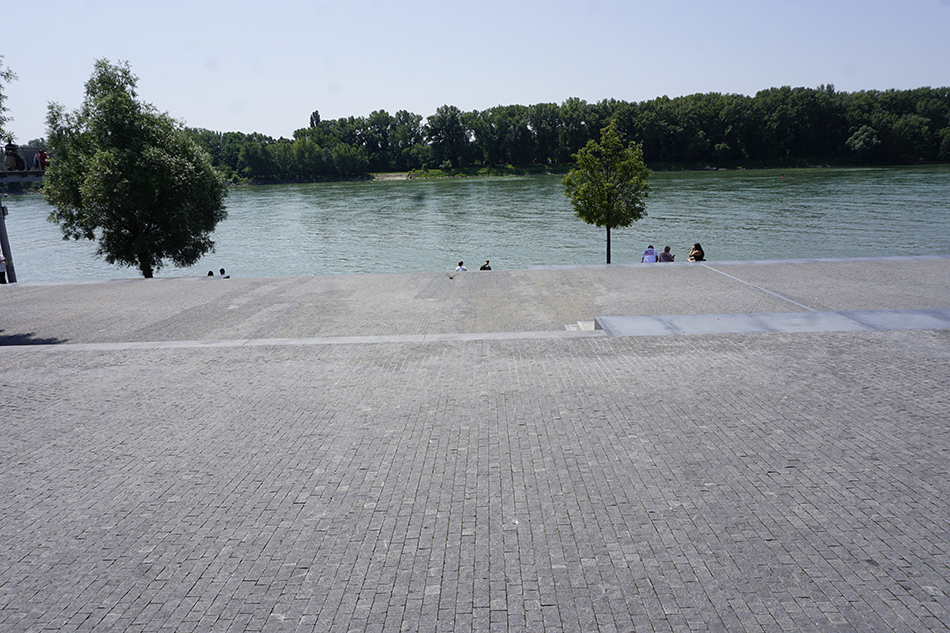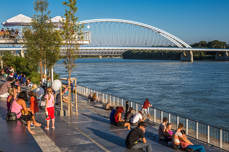 Pero para nosotros, uno de los más bonitos y gratificantes recorridos que recomendamos, es la ruta en bicicleta entre los puentes Stary Most (Puente Viejo) y el Puente Nuevo. La ruta comienza por el borde del río hasta el Centro comercial Eurovea, alojado en una gran plaza que reconoceremos por su prominente obelisco. Por los alrededores, se expanden laderas de hierba a orillas del agua sobre las que se reúnen grupos charlando, gente paseando o tomando el sol. Algunos bares con arena fina y confortables sofás ofrecen cócteles y comida. Elegantes restaurantes con terraza entre vegetación esconden platos más elaborados. Es una zona de esparcimiento muy “chill-out”.