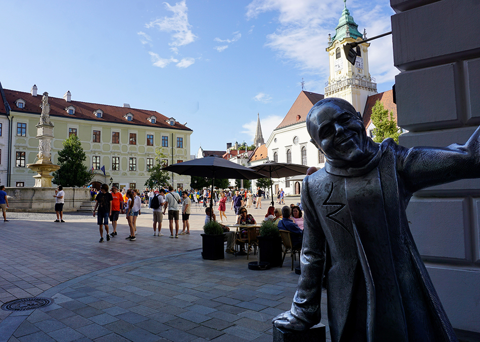 Una curiosa estatua de un soldado del ejército de Napoleón a tamaño natural se halla apoyado en uno de los bancos de la plaza siendo el deleite de muchos visitantes que no dudan en sentarse a fotografiarse acompañados del indiscreto personaje. Se dice que representa a un soldado francés herido llamado Johann Evangelist Hubert, que se enamoró de una enfermera de Bratislava, decidió vivir en la ciudad y comenzó a producir un vino espumoso basado en la tradición francesa. Hubert es ahora el nombre del vino espumoso más famoso de Eslovaquia.