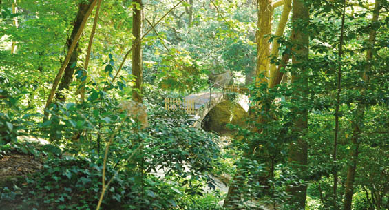 Rodeó además el palacio de un amplio parque con árboles raros y exóticos, decorado con fuentes, regatos de agua y cadenas de lagos, casas, capillas, falsas ruinas, todo ello recorrido por caminos mágicos  que no existen en ningún otro lugar.