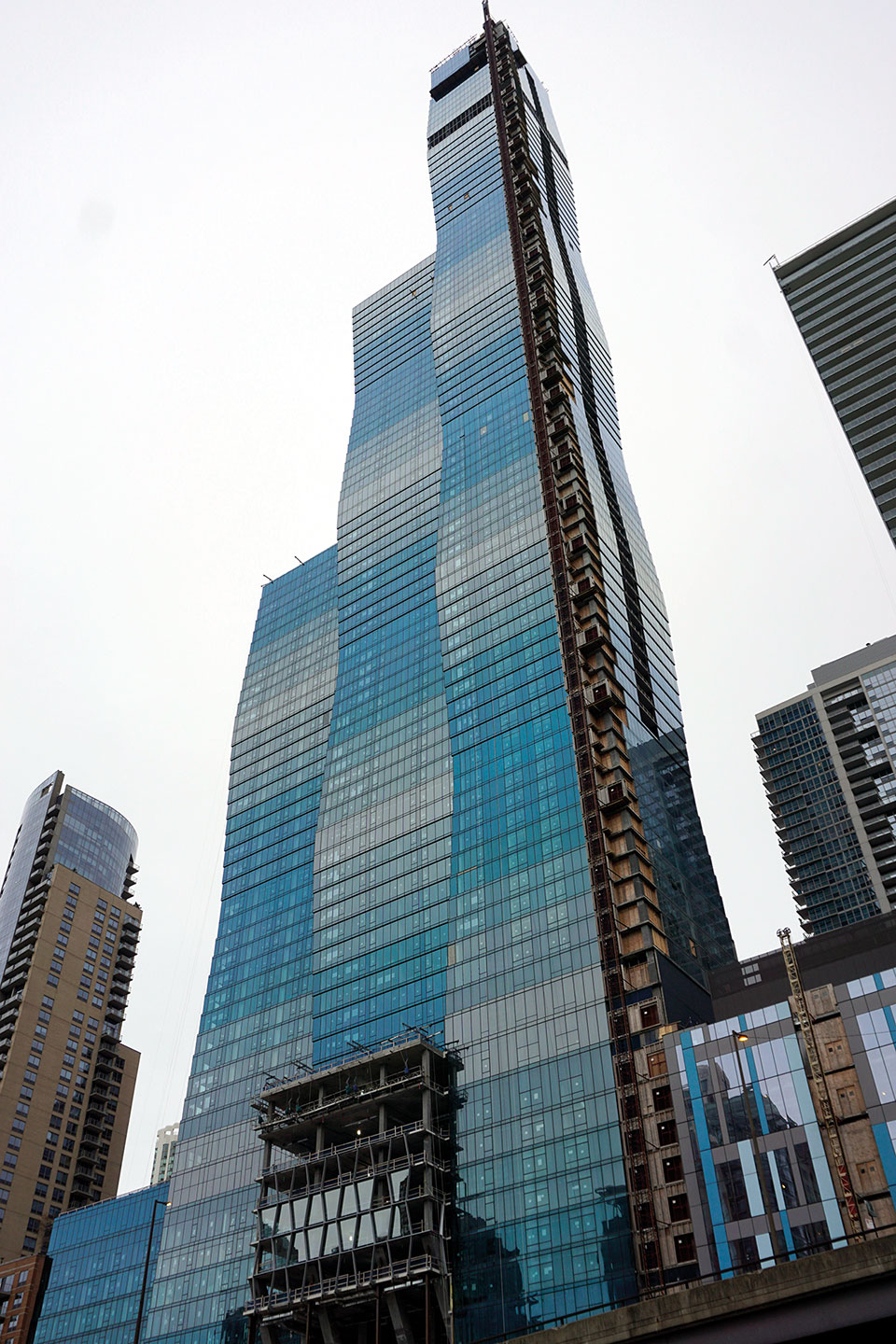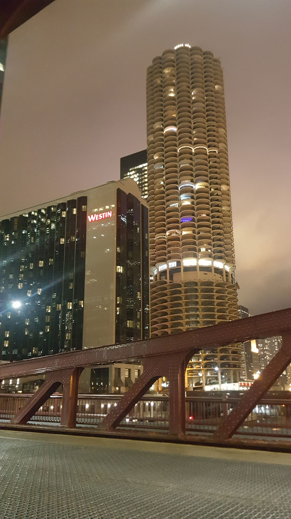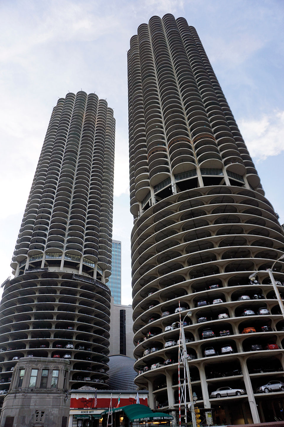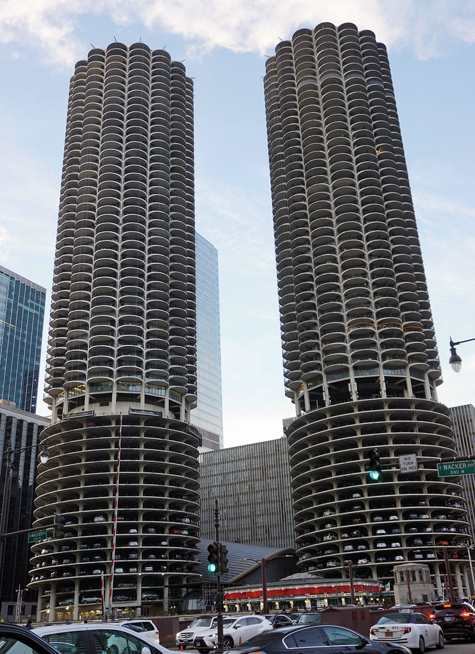 Se trata de torres residenciales, reconocibles por majestuosas terrazas de forma curva, que las diferencian del resto. Con 65 plantas cada una, las primeras están destinadas a un aparcamiento en rampa que se puede ver desde la calle. Son varios los vehículos que circulan por ellas y algunos aparcados. Dispone de servicio de aparcacoches, por si algún propietario teme caerse al río, hecho que apunta que pueda haber ocurrido alguna vez. Bajo la plataforma en la que se asientan las torres sobre el río, se alinean pantalanes privados para los propietarios con embarcación. Todo un lujo. Fueron construidas por Bertrand Goldberg, que planteó un proyecto que permitiera vivir y trabajar en el centro. El complejo se denominó Marina City y se le acredita como el responsable de reimpulsar proyectos residenciales dentro de las ciudades.