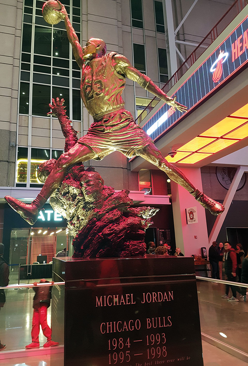 Llegamos pronto para disfrutar del gran ambiente previo al evento. Nada más entrar, en el vestíbulo de la entrada principal nos fotografiamos junto a la afamada estatua de bronce “The Spirit”. Un homenaje, al que es considerado el mejor jugador de baloncesto de todos los tiempos, Michael Jordan, que lideró a los Chicago Bulls en seis campeonatos de la NBA. Curioseamos las tiendas oficiales, bares, barras, comida típica americana, palomitas, puestos de hot dogs, marcas de cerveza…etc., que se hayaban distribuidas por los pasillos de acceso. Música, luces, gente y mucho alboroto indicaban la magnitud del evento. Ya se sabe …¡Todo a lo grande!