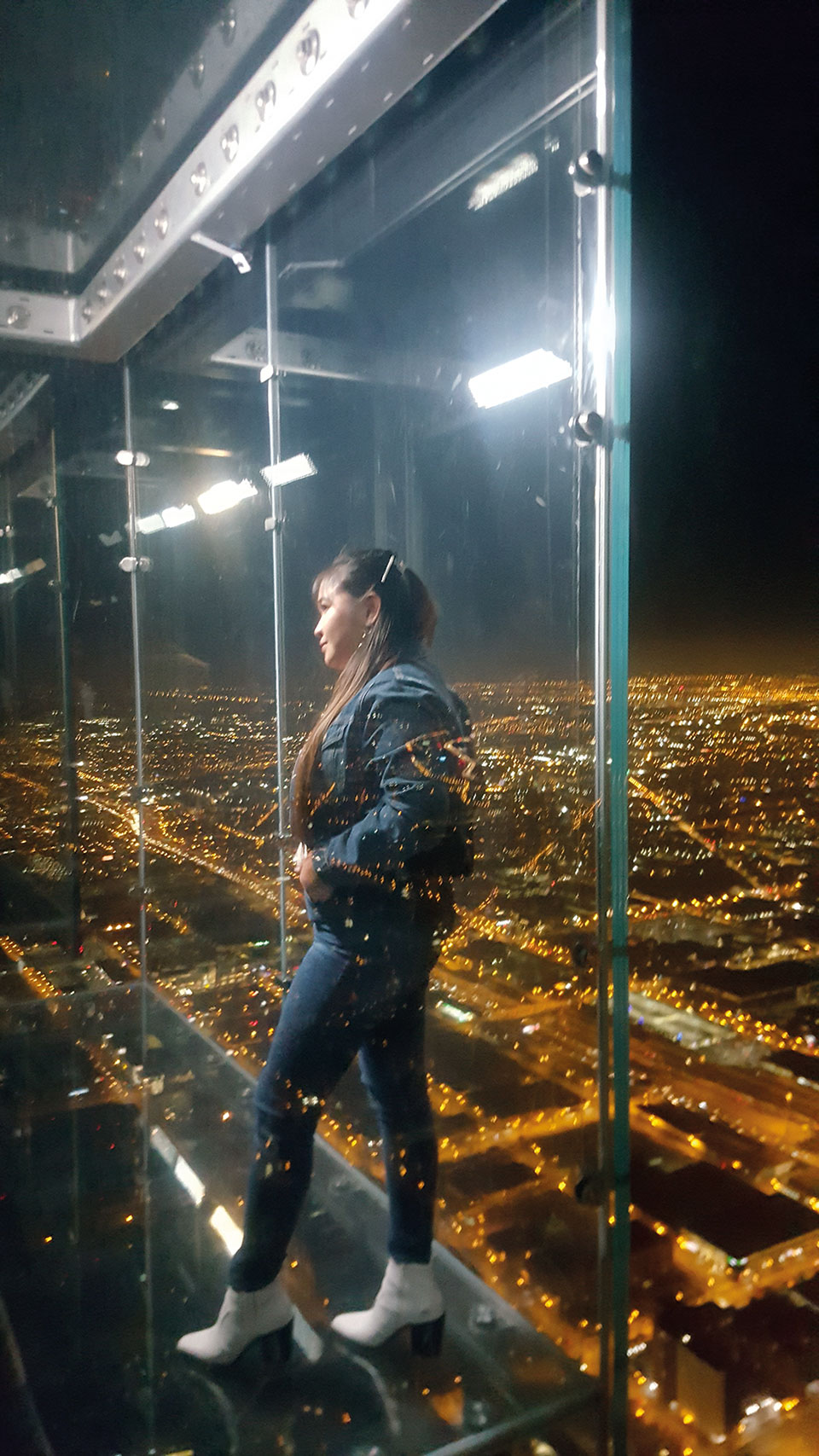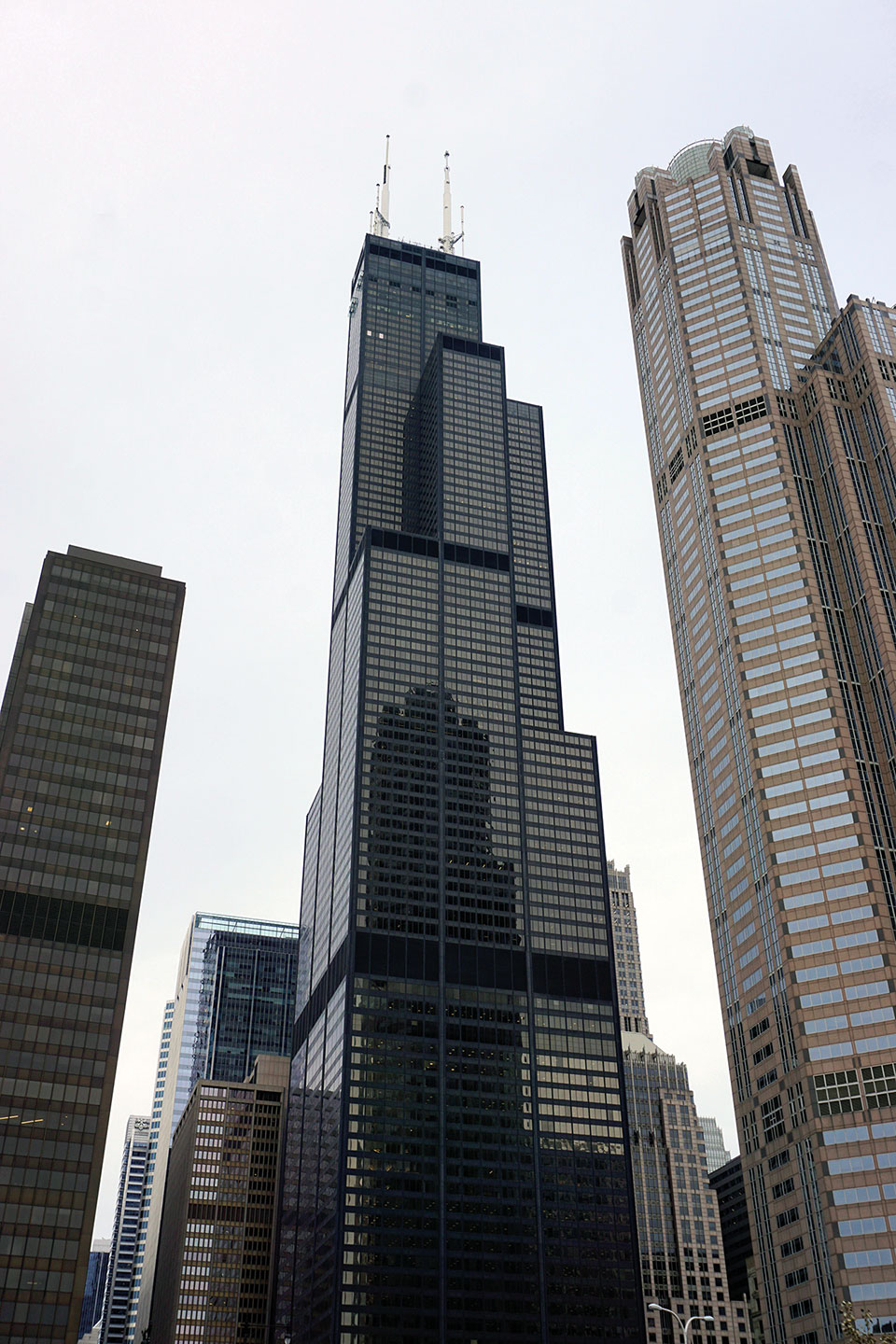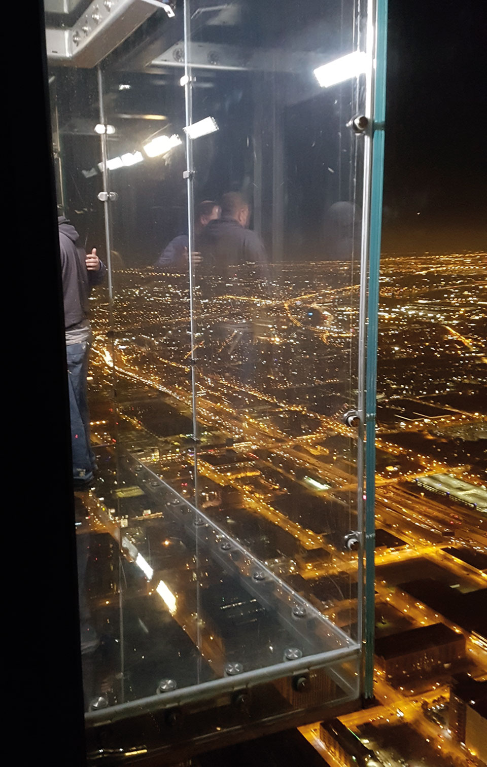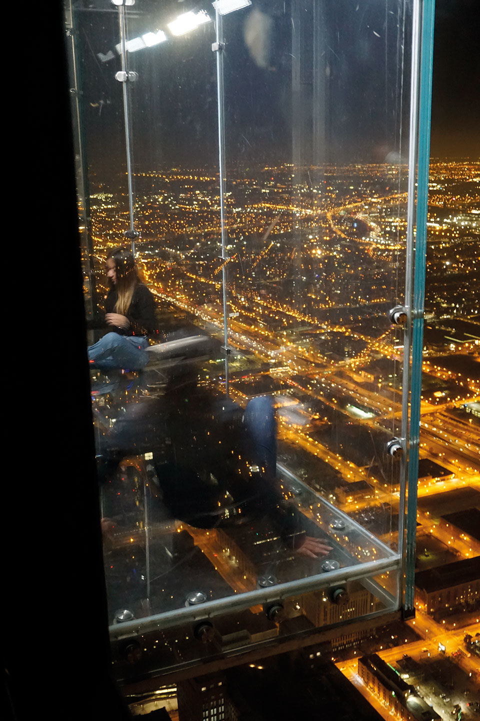 Al terminar, nos dirigimos al distrito financiero de Chicago, donde se levanta la famosa Torre Willis, (originariamente Torre Sears), un moderno y atractivo edificio de oficinas. Su construcción se inició en agosto de 1970 y durante casi 20 años defendió el récord de edificio más alto del mundo.  Actualmente, el mirador situado en la planta 103 Skydeck, es una visita obligatoria y una atracción turística de la ciudad. De vastos ventanales, esta plataforma de observación resulta innovadora con balcones de cristal que permiten vistas en todas direcciones, dando la sensación de estar suspendido en el aire. Para entrar al hueco acristalado encontramos una larga cola de aproximadamente unas dos horas. Como es de comprender, nos quedamos sin la tan popular fotografía, pero disfrutamos igualmente de las imponentes vistas del anochecer que nos ofrece el resto del recinto. Quizá el encendido de las luces de la ciudad al atardecer, es el elegido por la mayoría, y un mal momento debido a la gran afluencia de público. Un dato a tener en cuenta si no quieres perder dos preciadas horas esperando tu turno.