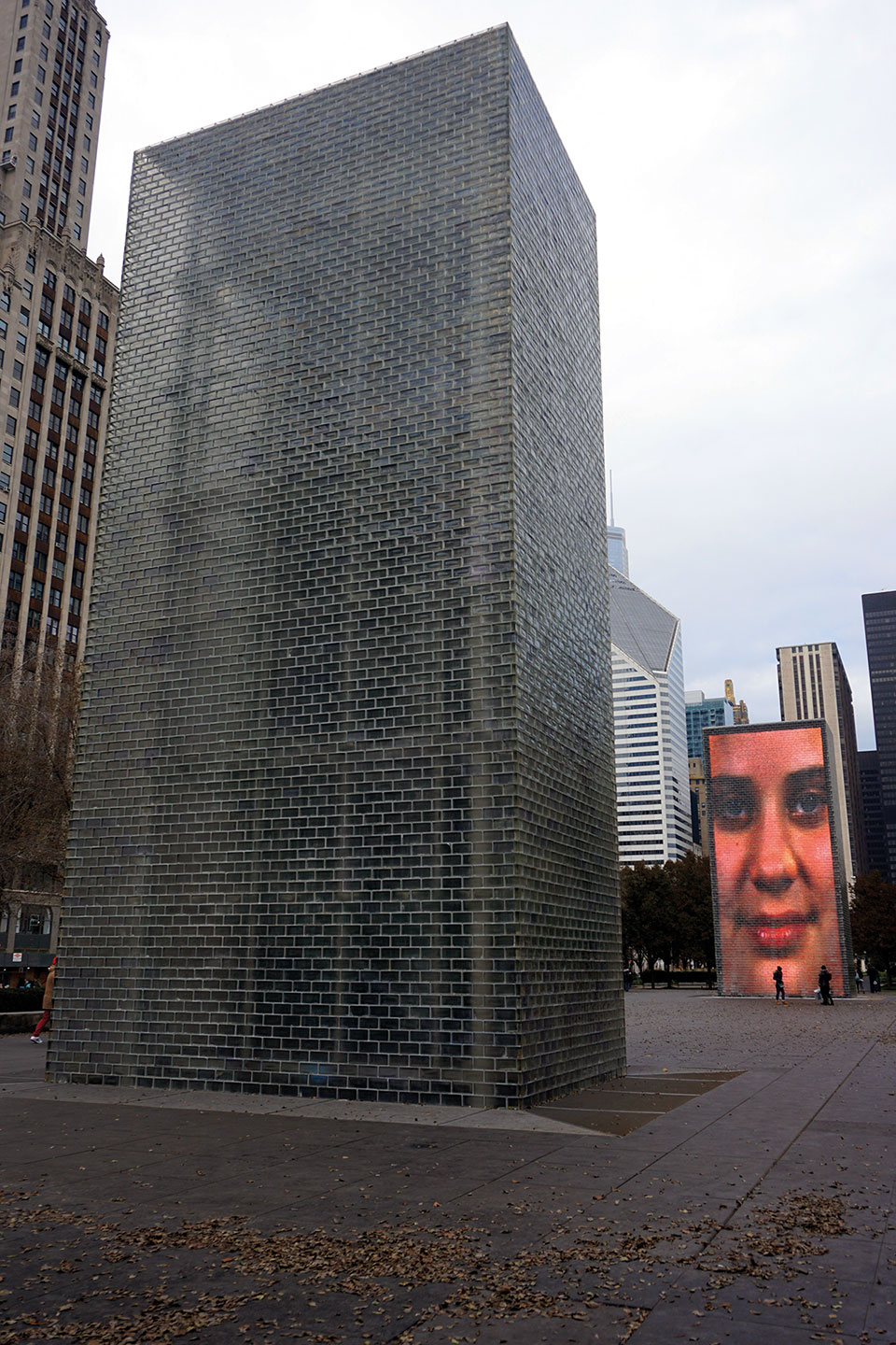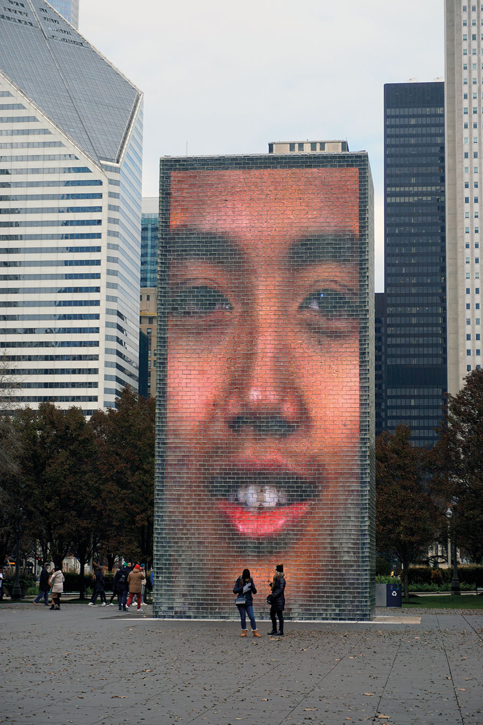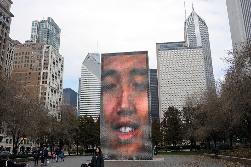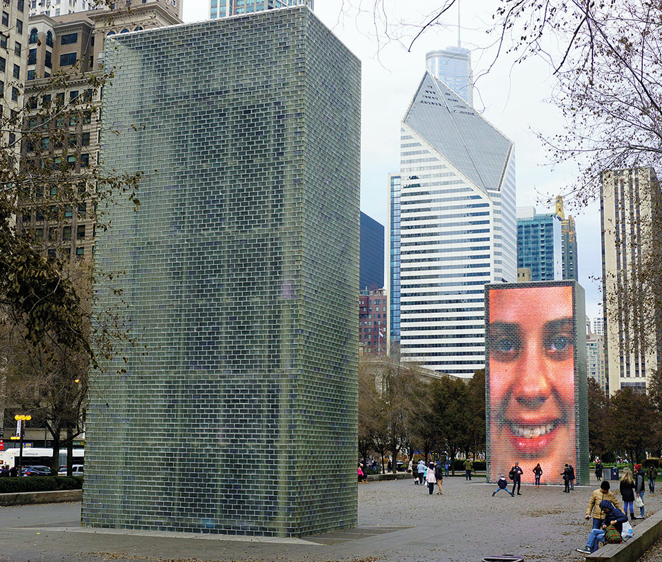 Otra de las atracciones del Millennium Park es la Fuente Crown, diseñada por el artista español Jaume Plensa, que consta de dos muros de 15 metros de altura, uno frente a otro en los extremos de una plaza pavimentada. Cada muro ilumina y proyecta desde dentro, imágenes de rostros de vecinos de la ciudad, previamente grabados que cambian cada 5 minutos. Gesticulan, sonríen lentamente, hasta que abren la boca por la que sale un chorro de agua que cae con estrépito al pavimento. Cuando termina, el agua fluye también por los laterales en forma de cascada, hasta una nueva proyección. Otro espectáculo al aire libre, lugar de descanso y entretenimiento, que en la época de verano agradecen niños y adultos, pues claramente incita a un remojón.