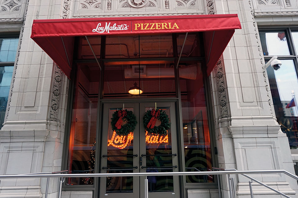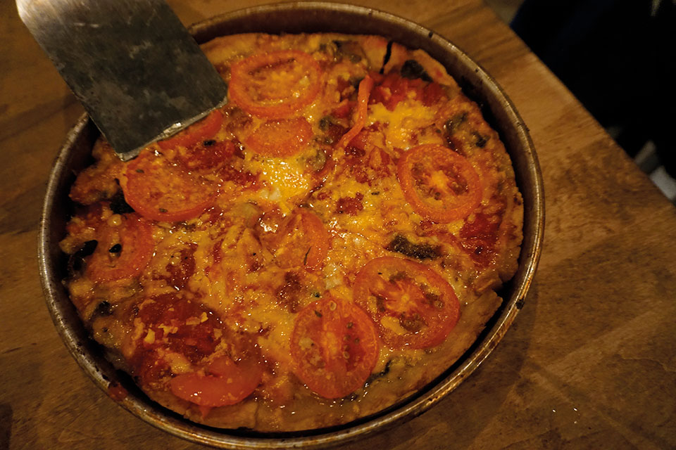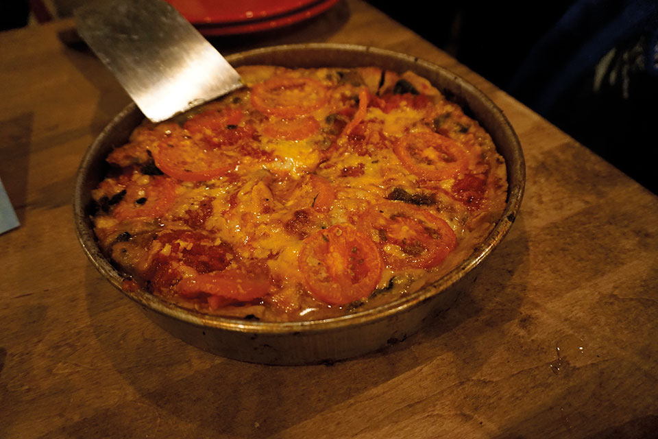 Antes de subirnos a uno de los edificios más emblemáticos que paso a detallaros en breve, nos dirigimos a Lou Malnati’s a degustar uno de los platos más célebres del que ya habíamos oído hablar, la pizza estilo Chicago. Se trata de una pizza servida en una sartén profunda, de masa muy, muy crujiente. Está riquísima, es bastante consistente ya que el relleno es abundante. Entre los ingredientes de la más clásica se halla la salchicha, salsa de tomate, cebolla, pimiento y queso. Puedes añadir otros y/ o hacerla a tu gusto. Es muy sabrosa, y si se pide algún entrante, puede que no puedas acabarla.