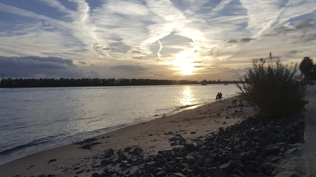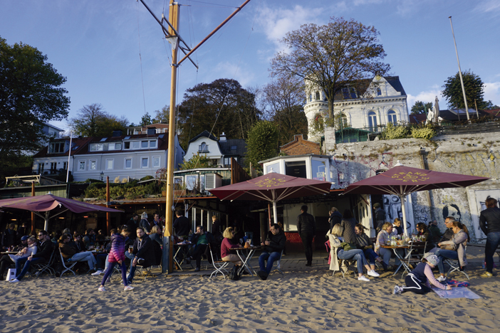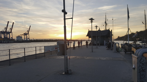 El paseo por la ribera del Elba en el Ferry 62 es una maravilla. Se coge en Landungsbrücken y sale cada 15 minutos. Tiene unas 5 paradas y regresa por el mismo camino de ida. Recomendamos bajar en la parada de Neumühlen donde el paseo entre casitas de cuento y jardines nos lleva a una playa muy peculiar y frecuentada entre chiringuitos. Observar el trasiego y de los inmensos buques del tamaño de un edificio  repletos de containers, y todo cuanto acontece en el río, resulta bastante curioso y placentero bajo la puesta de sol.