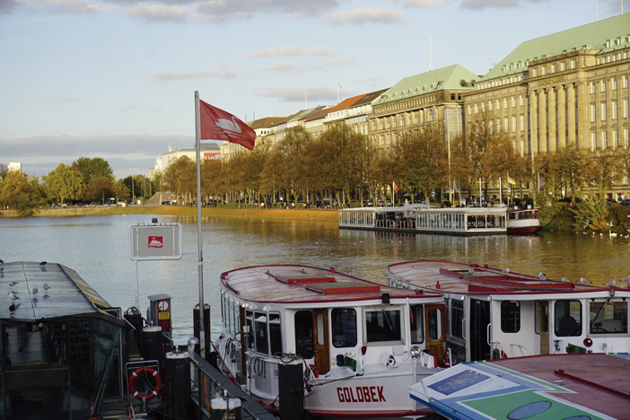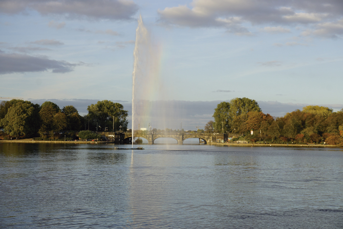 Cercano a este emplazamiento, el río Alster forma dos lagos artificiales, uno interior, más pequeño conocido como  “Binnenalster” en el que una fuente expulsa agua a gran altura creando así bonitos juegos de luz. Un lugar muy seductor y popular para hamburgueses y turistas, que disfrutan paseando o relajándose en las terrazas y heladerías de los alrededores.
