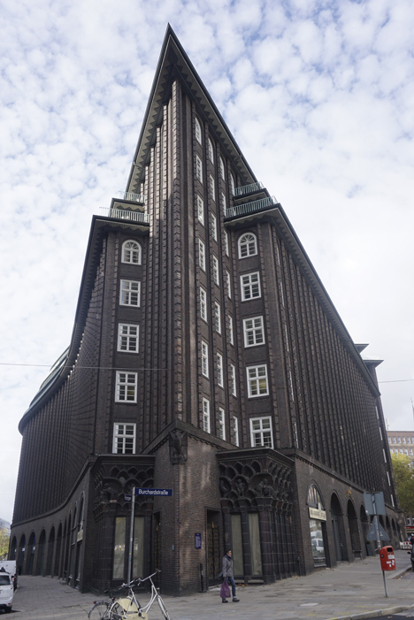 En el barrio de Kontorhaus, no pasa desapercibido el edificio de arquitectura de ladrillo rojo conocido por “Chilehaus”. Esto es  un conjunto de oficinas construidas entre 1920 y 1940 donde se ubican las sedes de empresas dedicadas a actividades portuarias y mercantiles. La edificación desvela el desarrollo del comercio internacional de Hamburgo a finales del siglo XIX y principios del XX. El comerciante Henry B. Sloman, que había hecho fortuna con la sal traída de Chile, se lo encargó al arquitecto Fritz Höger. El edificio es sorprendente por tener la fachada en punta, que recuerda a la proa de un buque.