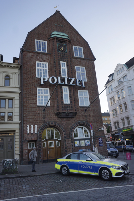 También en Reeperbahn encontramos la comisaría de policía más famosa de Alemania, “Davidwache”, tanto por  las series y películas rodadas allí, como por su actividad al estar ubicada en este conflictivo lugar a partir de ciertas horas. Por sus aledaños nos cruzamos con Hans Albers Platz, que cobra vida de noche. Rodeada de bares que suele ser el inicio y/o fin de la fiesta nocturna.