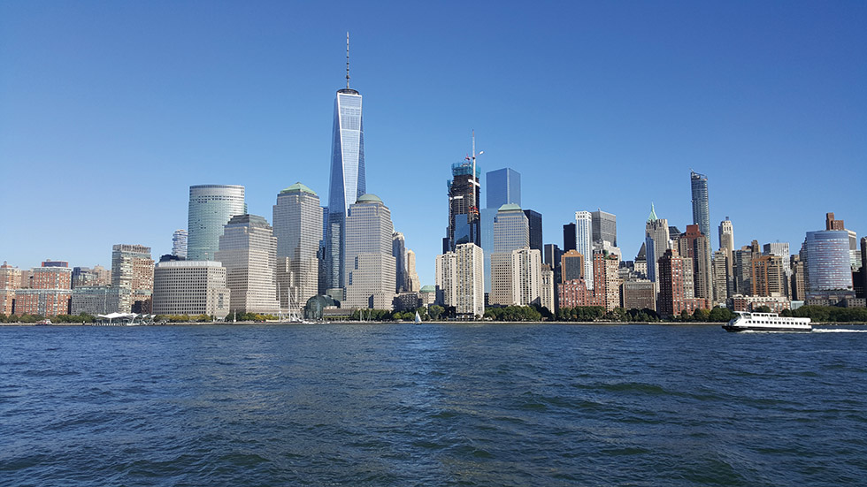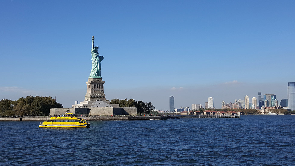 Considerando los pocos días que estamos en la ciudad y que la excursión a la Estatua de la Libertad y la Isla de Ellis lleva de tres a cuatro horas debido a las colas y esperas, decidimos simplemente tomar un ferry gratuito a Staten Island que nos permitió ver la Estatua de la Libertad desde cierta distancia y nos dejó además perspectivas muy interesantes del skyline de Manhattan. Este ferry realiza el trayecto gratuito, partiendo cada 30 minutos desde las inmediaciones de Battery Park. El itinerario dura 25 minutos en los que salimos maravillados de las panorámicas de la Estatua de la Libertad, del downtown de Manhattan y del Puente de Brooklyn, y comentar que por cierto la Estatua es más grande e imponente de lo que en principio nos imaginamos. Regalo de Francia a Estados Unidos para conmemorar los cien años de independencia estadounidense, se convirtió en el símbolo de la inmigración durante la segunda mitad del siglo XIX, recibiendo a más de 9 millones de personas que llegaban a Nueva York en busca del sueño americano. Es difícil de apreciar, pero figura dando un paso al frente escapando de unas cadenas, en representación de la marcha hacia la libertad.