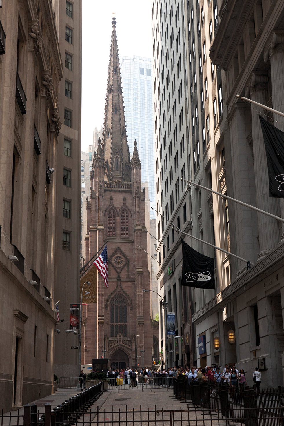 Seguidamente, nos dirigimos a conocer el barrio de los ejecutivos, que hay que hacerlo en día laboral si es posible, para saborear el ambiente frenético de un día de oficina. Según nos vamos acercando, observamos a jóvenes profesionales trajeados saliendo y entrando de grandes edificios, algunos café y móvil en mano. Pasamos delante del Banco de la Reserva Federal, donde se localiza el mayor numero de lingotes de oro del mundo y que, previa reserva, se puede visitar bajo estrictas normas de seguridad. Al parecer, permite ver algunos de los lingotes de oro que se guardan en su cámara abovedada. La arquitectura se torna neoclásica, apareciendo edificios de mármoles blancos, columnas y capiteles, atravesamos prestigiosos bancos, y llegamos a la calle más famosa del distrito financiero, Wall Street. Aquí se sitúa el Federal Hall, en el que ni más ni menos, en 1789 George Washington fue nombrado primer presidente de Estados Unidos. La estatua del presidente se halla en la entrada principal. Se puede entrar y alberga la biblia sobre la que juró Washington. La Bolsa de NY (New York Stock Exchange), el mayor mercado de valores del mundo, también la encontramos en esta calle y tenía la entrada permitida hasta los atentados del 11S.