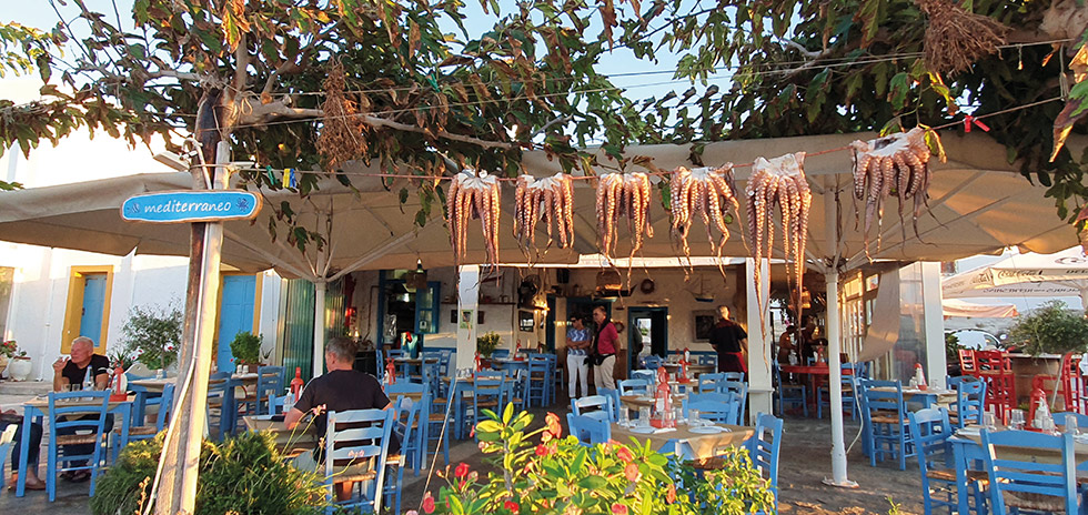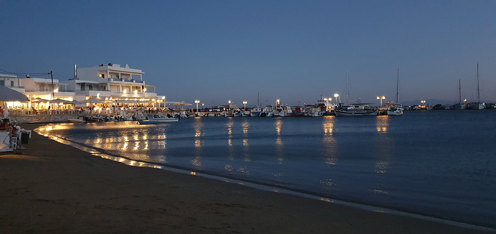 Paseamos por la playa de Funda Logaras, una playa de fácil acceso, con arboleda para refugiarse del sol. Y, por último, puesto que el tiempo no daba para más, llegamos a Piso Livari, otro pintoresco pueblecito donde comimos y estuvimos hasta bien entrado el atardecer. Muy aconsejable el Restaurante Halaris Fish Tavern (Halaris Ouzeri) situado en el pequeñísimo puerto, en el que disfrutamos de la cocina griega y el pescado a la parrilla capturado en el día. Si tenéis la fortuna de pasar por este lugar, no dejéis de probar las gambas baby fritas y las anchovies (boquerones), dos platos deliciosos, que, junto al selecto postre de yogurt, el servicio y amable personal, nos dejó un placentero recuerdo.