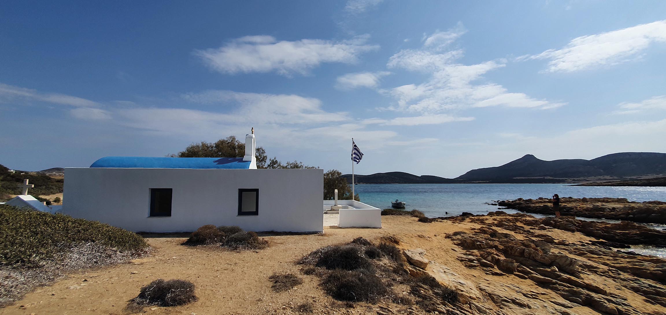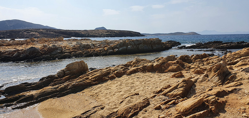 Las playas de Antiparos son vírgenes y salvajes. En la Playa de Soros, encontramos hamacas y sombrillas y nos recrearnos del baño en aguas turquesas. Seguidamente, dimos un grato paseo por la Playa de Sostes y nos dirigimos  a visitar la Cala de St. George, que, aunque no nos bañamos, fue la que más nos gustó. Está situada en torno a una bonita ermita donde las rocas han creado lagunas de aguas turquesas. El paisaje es agreste. En la parte opuesta encontramos una pequeña bahía de arena. Es una maravilla.