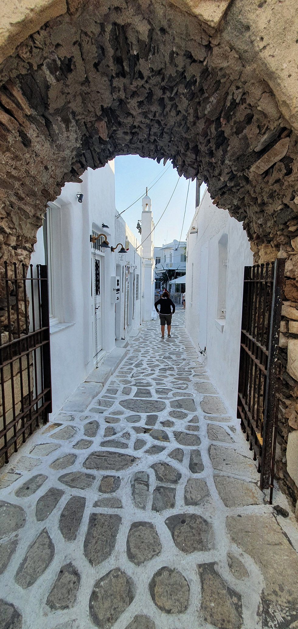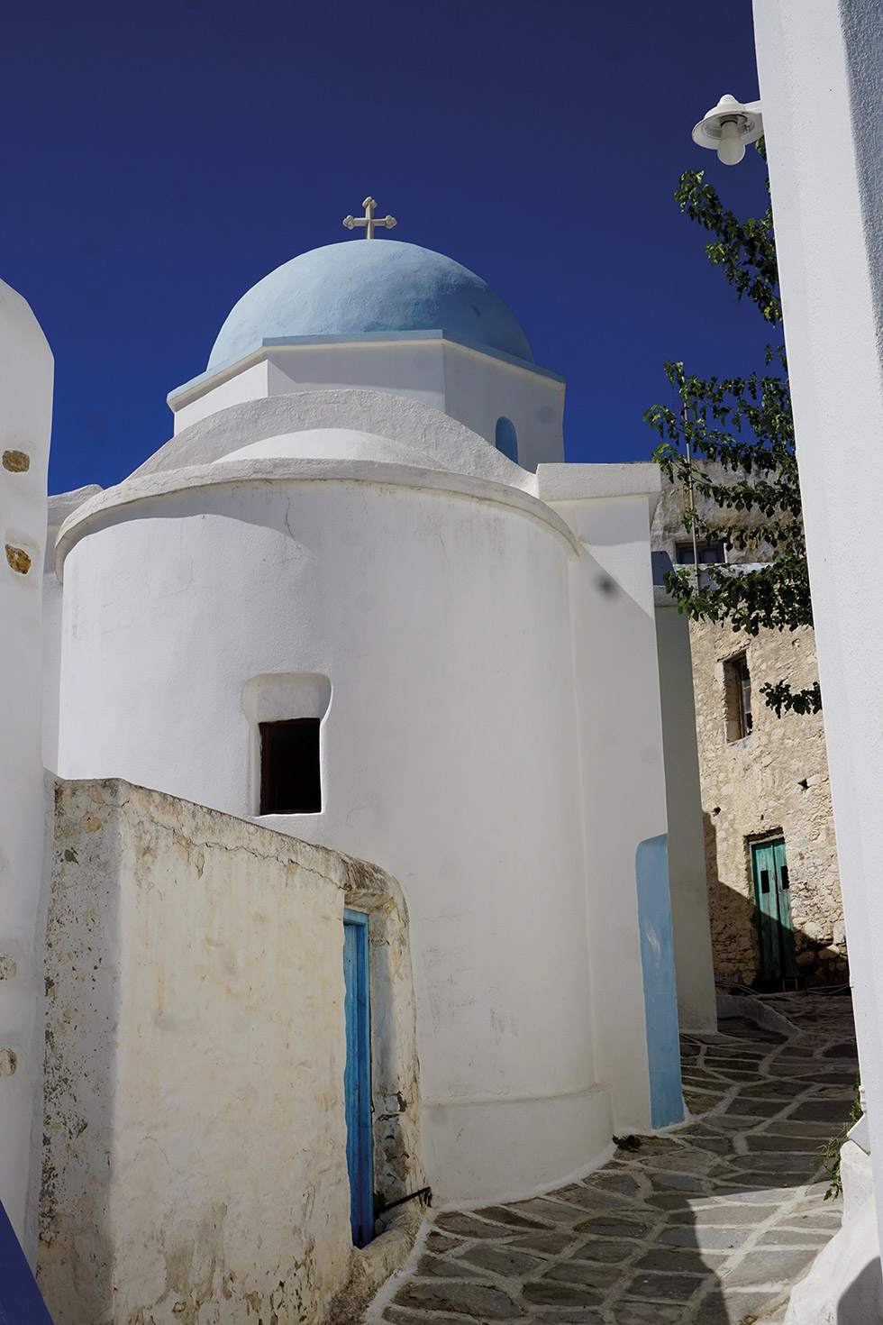 Callejeando llegamos a uno de los imprescindibles de Parikia, la iglesia bizantina de la Virgen Katapolianis, del siglo IV d. C. uno de los monumentos paleocristianos más importantes de toda Grecia, que sorprende por la edificación de piedra y techo de tejas, en contraste con la arquitectura cicládica. En la parte alta de la ciudad se halla un castillo veneciano del s. XIII y una torre defensiva de mármol reutilizado de un templo antiguo, desde donde se obtienen unas buenas vistas. También resulta interesante el Museo Bizantino, El Museo Arqueológico o la necrópolis de la ciudad antigua con tumbas del siglo VIII a.C.