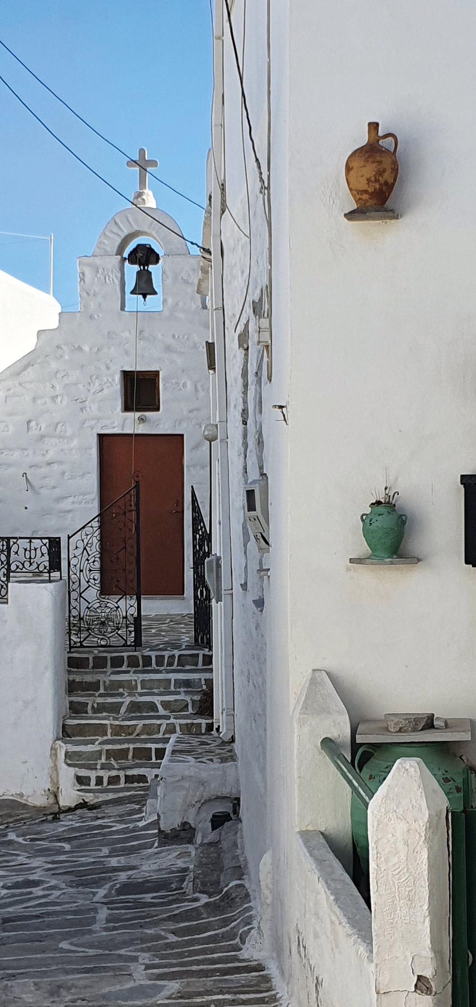 El tercer día visitamos Lefkes, la antigua capital de Paros. Un bello pueblecito situado entre montañas en el centro de la isla. Según íbamos aproximándonos descubríamos el hermoso panorama:  sobre una dorada loma, sobresalía un antiguo molino que parecía sacado de un cuadro y al sur de la ladera de casitas blancas, destacaba una imponente Catedral con dos campanarios. Continuamos la carretera hasta lo más alto de Lefkes, dejando el vehículo en un aparcamiento gratuito en lo más alto del municipio.