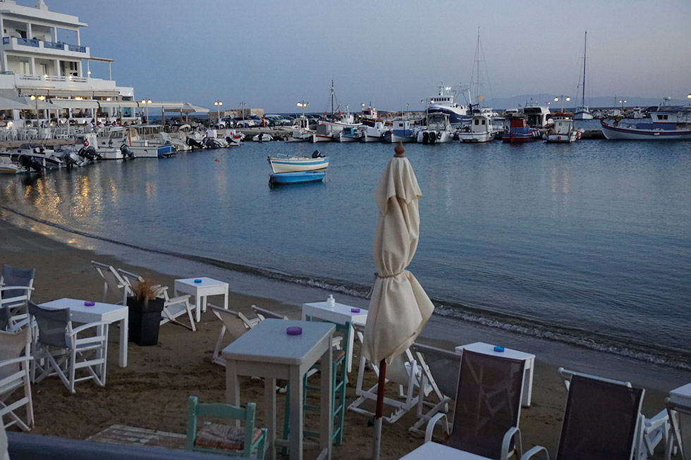 Después de un pequeño recorrido por el admirable paseo marítimo, en el que destaca un flamante molino de viento, nos dirigimos al norte de la isla, al Contaratos Beach Hotel, en Naoussa, donde estábamos alojados. El hotel se encuentra en una zona muy apacible en primera línea de la Playa de Agioi Anargyroi, que es ideal para los que buscan un poco de relax. Lo primero fue disfrutar del baño en sus aguas cristalinas. Un bonito paseo por la arena nos lleva al final de la playa donde un diminuto puerto natural alberga algunas barcazas. Caminando por el llano acantilado, las rocas crean piscinas naturales de aguas turquesas. Desde este punto se obtienen bellas fotografías de Naoussa, un antiguo pueblo de pescadores que, aunque se ha vuelto un poco turístico, todavía mantiene su autenticidad.