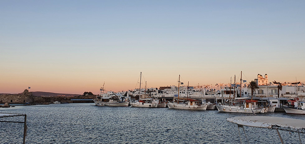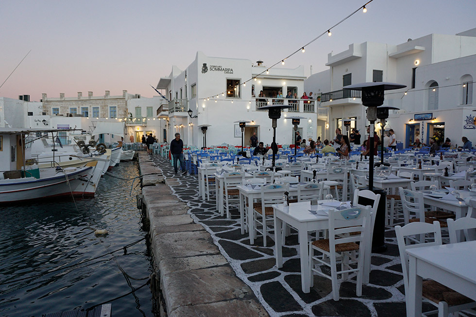 Cenamos en Naoussa, un pueblo tradicional marinero que se ha convertido en un lugar de moda. Es conocido como el mejor sitio de la isla para ir de compras y disfrutar de buenos restaurantes. De día es muy tranquilo, pero de noche se transforma con animadas terrazas junto al mar.
