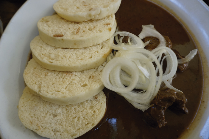 La cocina checa tiene una clara influencia de la alemana y austriaca, y como es de suponer, uno de los platos más típicos es el goulash, un guiso de carne con verduras. La cocina checa también goza de deliciosas sopas, como la de patata (recomendable) y que junto con la ternera asada en salsa, el pato asado, y la carne cerdo asada acompañada de col agridulce, forman parte de los imprescindibles. Los platos se acompañan de patatas, verduras o ensalada, aunque un acompañante muy típico son los “knedliky” una especie de rebanadas de harina. En cuanto a los platos de pescado por la cercanía al río Moldava suelen ser de carpa ó trucha.
