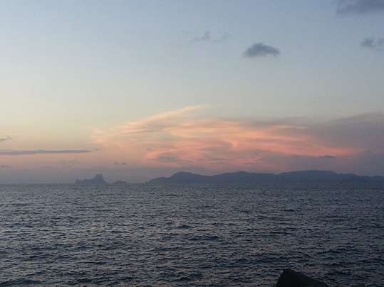 En nuestro tercer día pusimos rumbo a una de calas las más hermosas, Cala Saona. Situada al oeste de la isla. Nuestra sorpresa fue que no es una cala solitaria al encontrarse en ella ubicado un hotel. Desde el mar, la imagen que nos presenta es el de una piscina natural al aire libre y en un entorno fascinante lleno de cuevas. Pecnoctar teniendo por techo una infinidad de estrellas y despertar en este paraíso no tiene precio. La caída del sol desde el barco en este punto fue mágica sin duda.