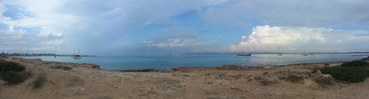 Y justo al lado opuesto, (recordar que la isla tiene solo 2 km de ancho en sus puntos más cercanos) al sur de la isla, Playa de Mitjorn. Una enorme playa que recorre toda esta parte del litoral y en la que es difícil encontrar problemas de espacio. Arena blanca, zonas de pinos y dunas, y aguas transparentes es lo que domina a lo largo de este área de costa. Es en esta larga franja de fina arena blanca, donde descubrimos algunos lugares con encanto, como el “Pirata Bus” en el Km 11 de la carretera de La Savina a La Mola, a pie de playa de Es Arenals. Un sugerente chiringuito de madera donde la puesta de sol es un placer al ritmo de Andrea Boccelli y de sus deliciosos mojitos y variados cócteles.