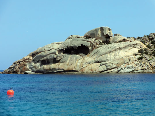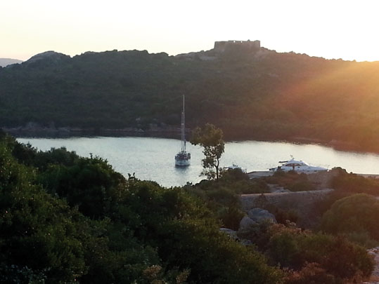 Llegamos a la isla deshabitada de Santo Stefano, buscando cala para pasar la noche y nos encontramos con la Cala di Villamarina, de exuberante vegetación y roca. Un idílico lugar para contemplar el atardecer desde lo alto de la colina. Las vistas son maravillosas. En esta isla está la fortaleza de San Esteban o San Jorge, un fuerte Napoleón, construido a finales del siglo XVIII.